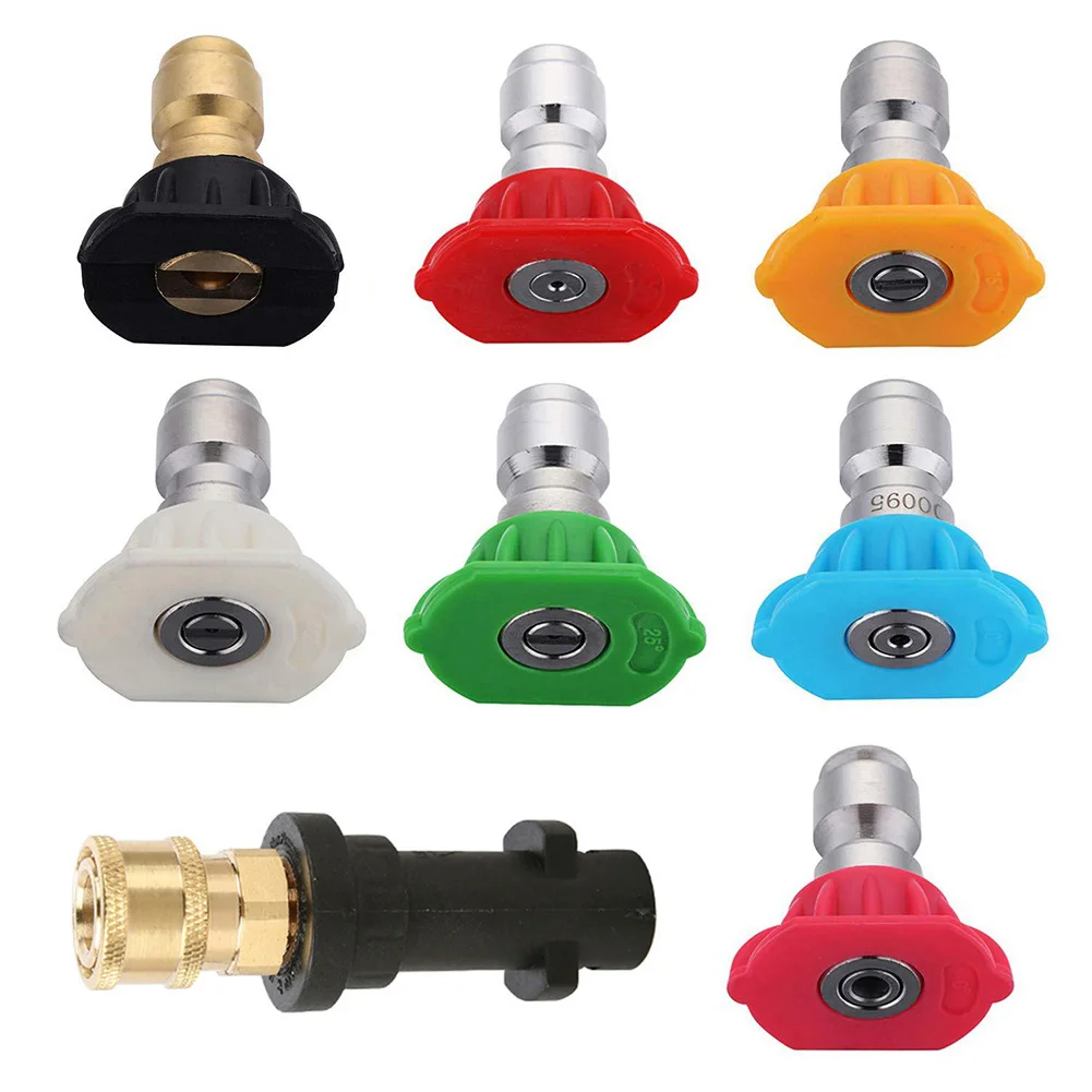 Nous avons testé l’adaptateur de pistolet de lavage à haute pression avec un nettoyeur haute pression Karcher K5 et nous en sommes très satisfaits. L’adaptateur s’installe facilement et se connecte solidement au pistolet de pulvérisation. Les 5 buses fournies offrent une large gamme d’options de pulvérisation, ce qui nous permet de nettoyer efficacement différents types de surfaces. De plus, les buses en acier inoxydable sont résistantes et durables, assurant une longue durée de vie.