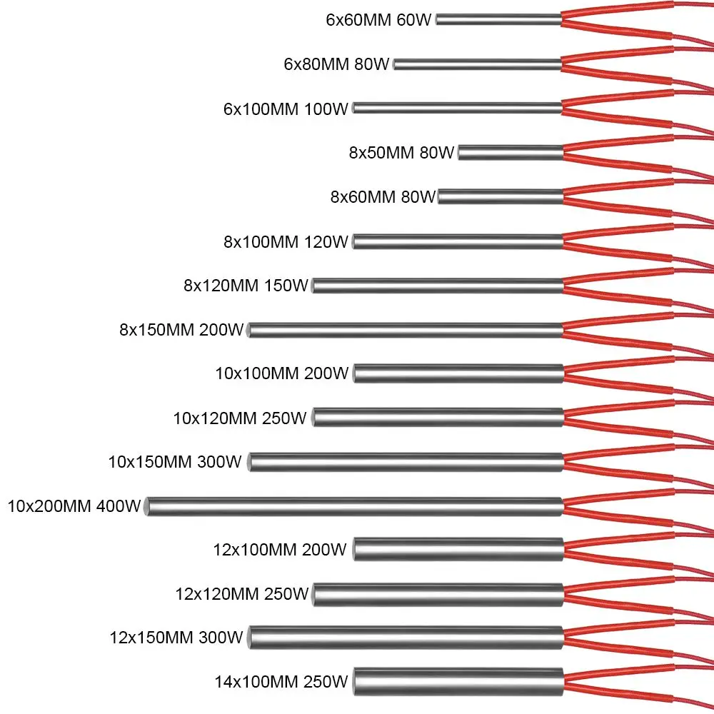 L’allumeur de tube chauffant est disponible en différentes dimensions, allant de 6x60mm à 14x100mm.