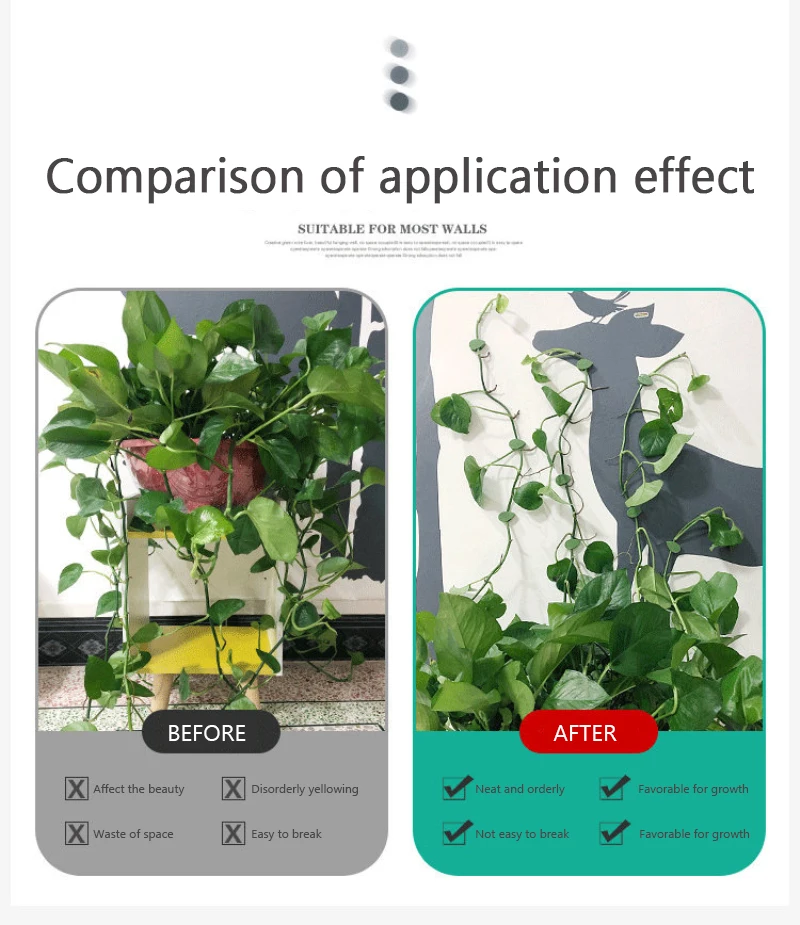 — Installation facile: L’installation est simple et ne nécessite même aucun outil. Utilisez vos doigts pour ouvrir doucement les clips de la plante, mettez les vignes de la plante dans le clip, bouclez-le et collez les clips de fixation de la plante sur le mur.
