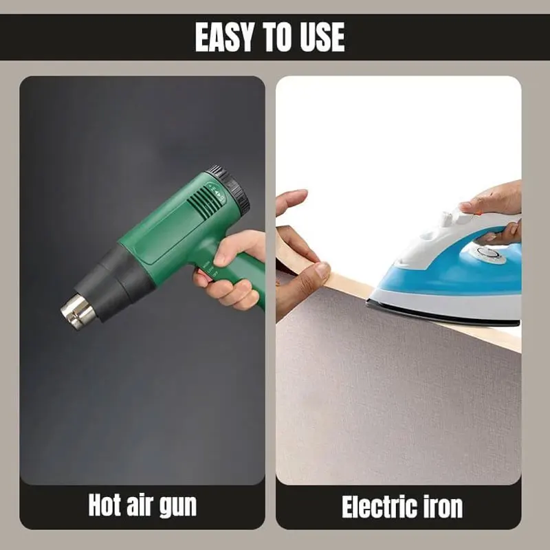 R: Il suffit de chauffer la colle thermofusible à l’intérieur de la bande avec un pistolet à air chaud ou du fer, puis de l’appliquer directement sur la surface du meuble.