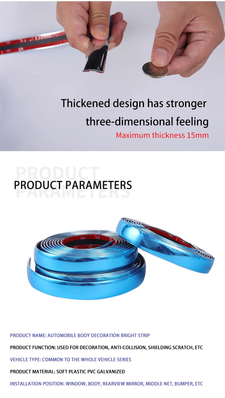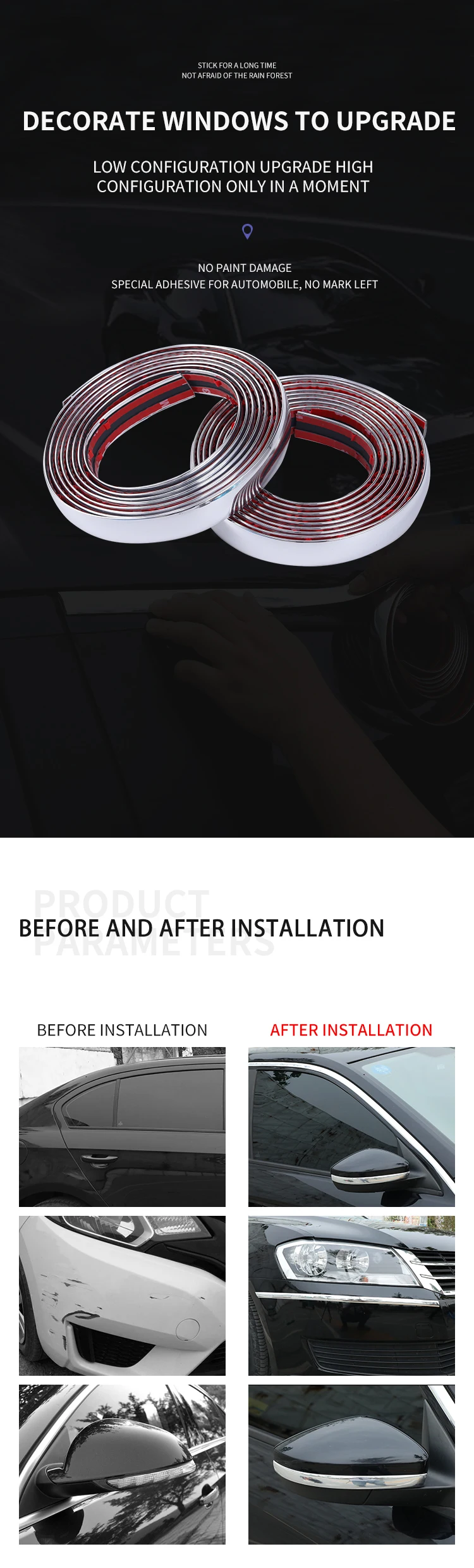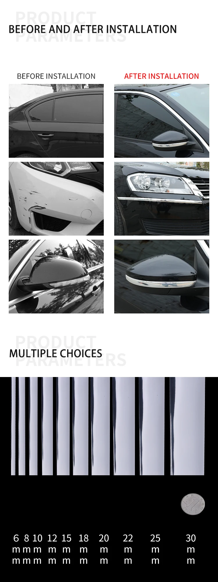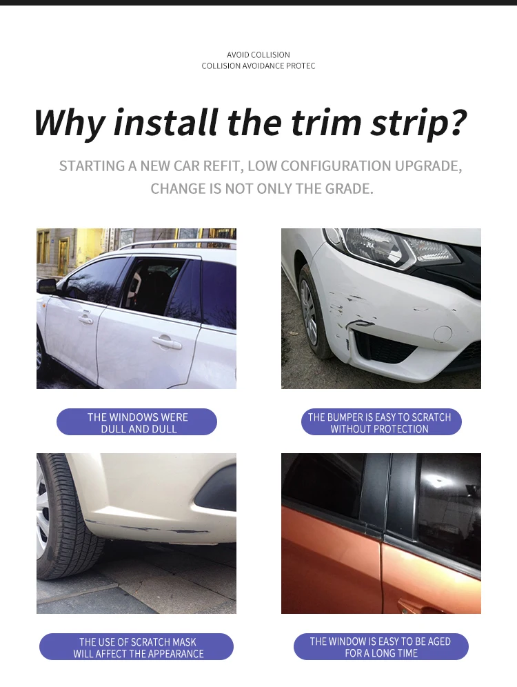 Ce produit est flexible et facile à couper pour s’adapter à toutes les tailles nécessaires. Il convient pour tailler le côté de la carrosserie, le bord de la fenêtre de la porte, le pare-chocs, la calandre avant, le capot de la voiture, le rétroviseur latéral, les phares, les feux arrière et les phares antibrouillard.