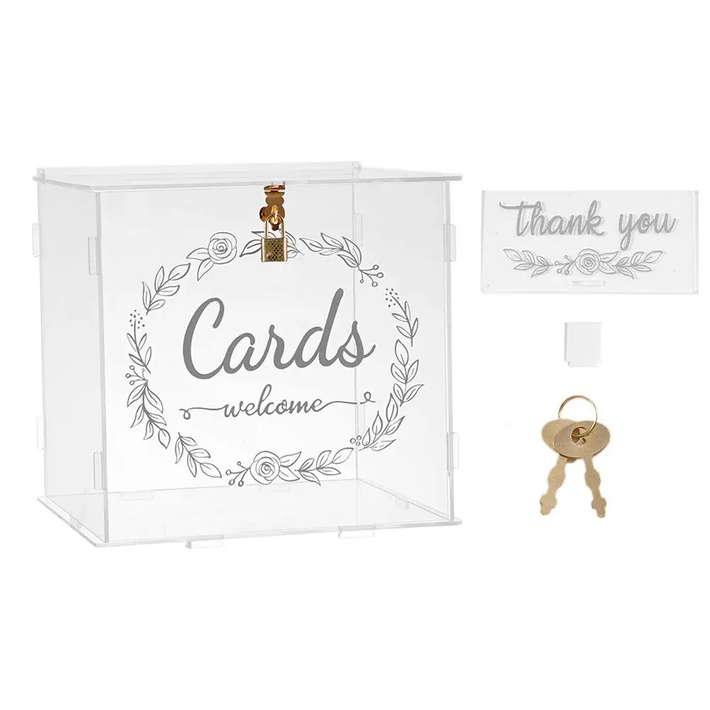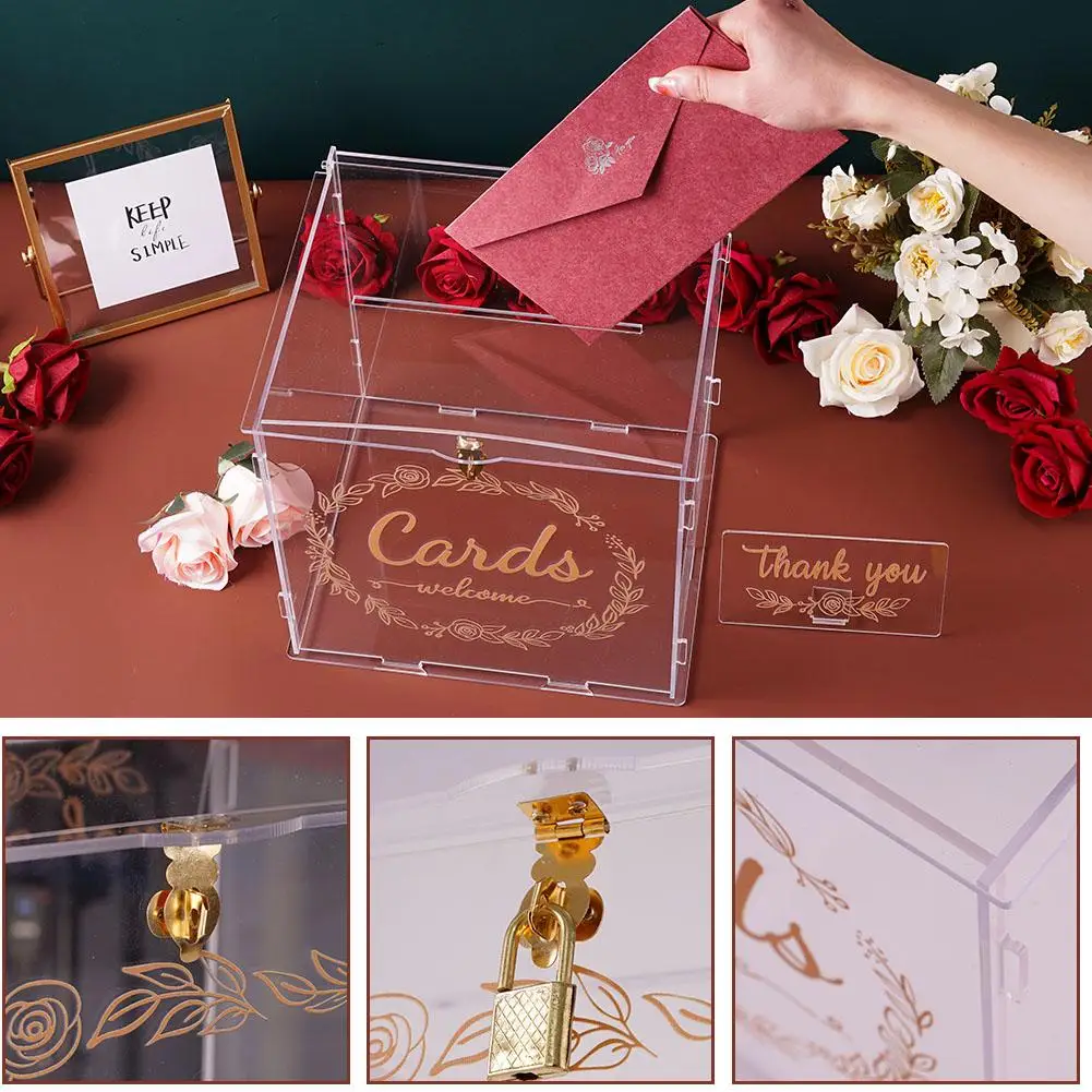En résumé, la boîte à cartes de mariage en acrylique est le compagnon idéal pour toutes les fêtes et événements spéciaux. Sa conception pratique et esthétique en fait un accessoire indispensable pour recueillir les cartes et les souhaits de vos invités.