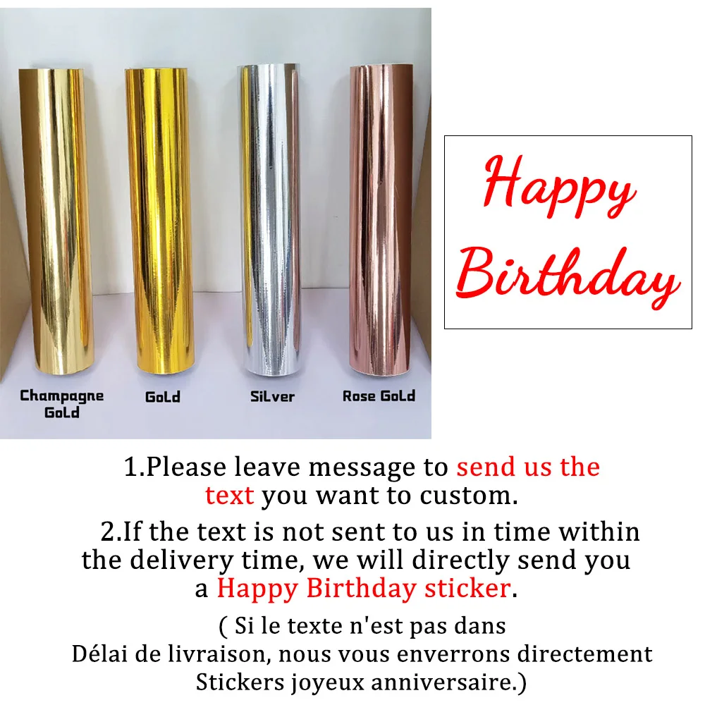 - Veuillez nous envoyer le texte dans le délai de livraison, ou nous vous enverrons un autocollant « Joyeux anniversaire ».