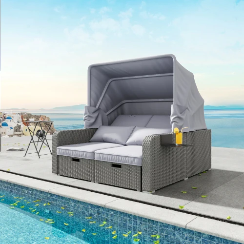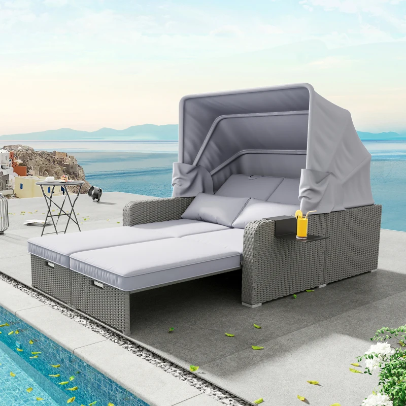 Ce canapé de jardin offre de multiples fonctions, pouvant être transformé en lit ou en chaise de loisirs, ou utilisé comme chaise d’amour pour deux personnes. Les coussins peuvent être placés contre le mur arrière pour éviter de glisser lors de son utilisation. De plus, le canapé est livré avec un auvent amovible et le fauteuil peut être étendu ou poussé en fonction de vos besoins.
