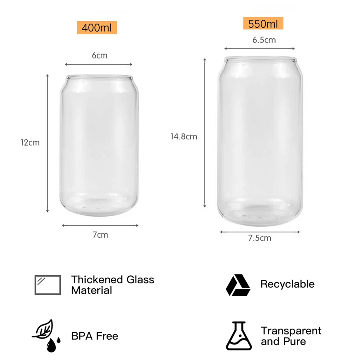 Le verre en forme de canette réutilisable standard est un produit de haute qualité qui répond aux normes de sécurité. Il est exempt de BPA, de phtalates et de PVC, ce qui vous permet de stocker des aliments et des boissons en toute confiance. De plus, il est facile à nettoyer et réutilisable.