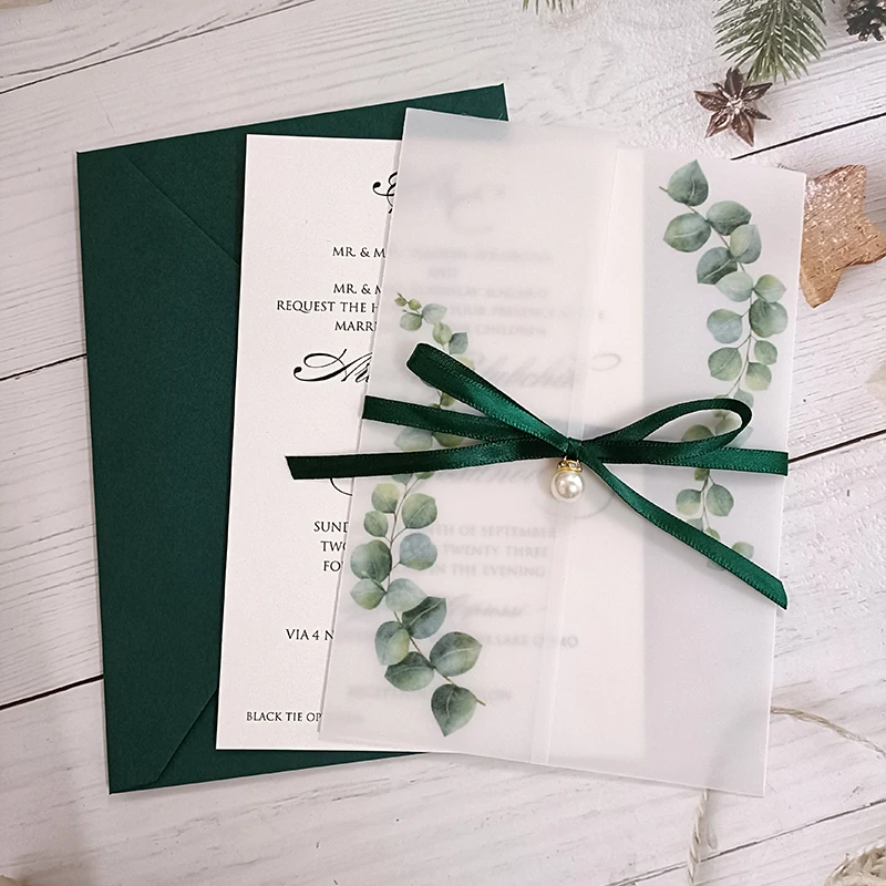Si vous choisissez « Print Whole set » : Vous obtiendrez 6 pièces: Carte de couverture extérieure + feuille intérieure vierge avec impression personnalisée (un côté avec un style) + ruban + enveloppe verte mate + sceau + strass perlé.