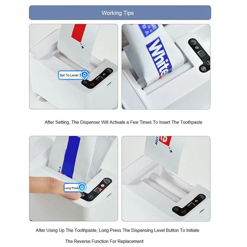 Ce distributeur de dentifrice est alimenté par des piles AA (non incluses) ou une batterie rechargeable intégrée. Il est fabriqué en ABS et composants électroniques de haute qualité. Ses dimensions sont d’environ 10.5*6.5*8cm. Il est livré avec un câble de charge USB.