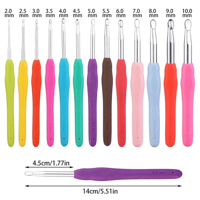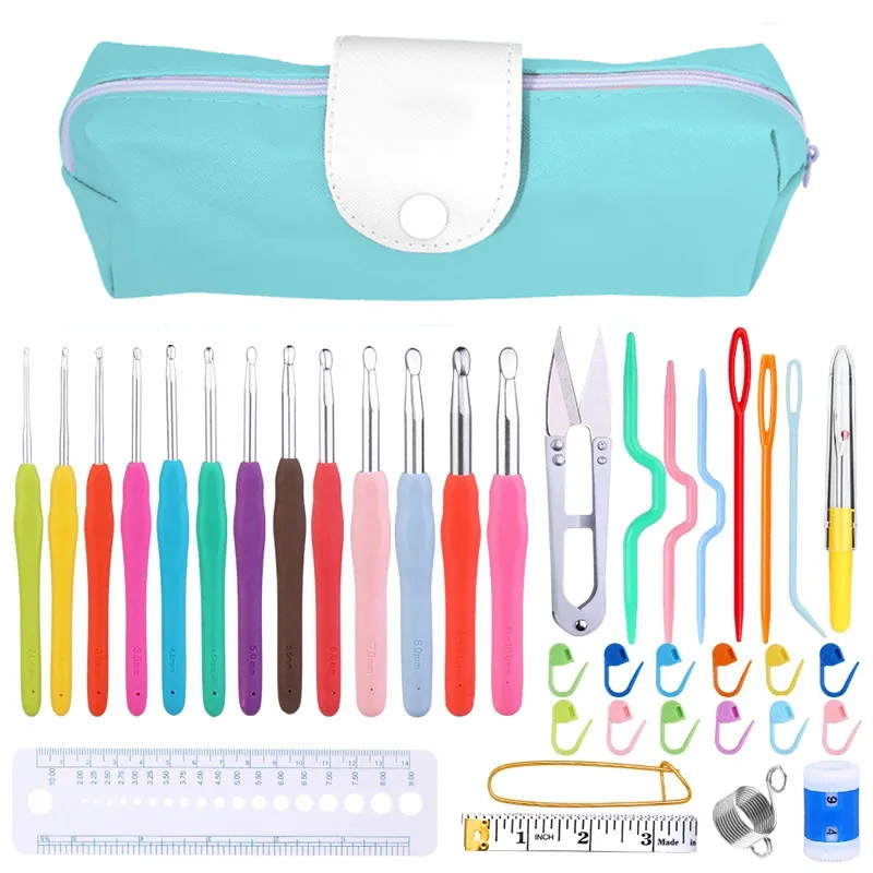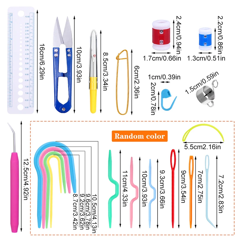 L’ensemble comprend différents éléments selon le type choisi. Pour le Type 1, il y a 2 compteurs, 1 sac en tissu, 1 Ciseaux roses, 10 clips en plastique, 1 ruban à mesurer et 6 crochets de différentes tailles (2.0/3.0/4.0/5.0/6.0/7.0mm). Pour le Type 2, il y a 1 Règle, 1 sac en tissu, 10 clips en plastique, 3 aiguilles torsadées, 2 aiguilles en plastique, 1 Ciseaux violets et 8 crochets de différentes tailles (2.0/3.0/3.5/4.0/4.5/5.0/6.0/7.0mm).