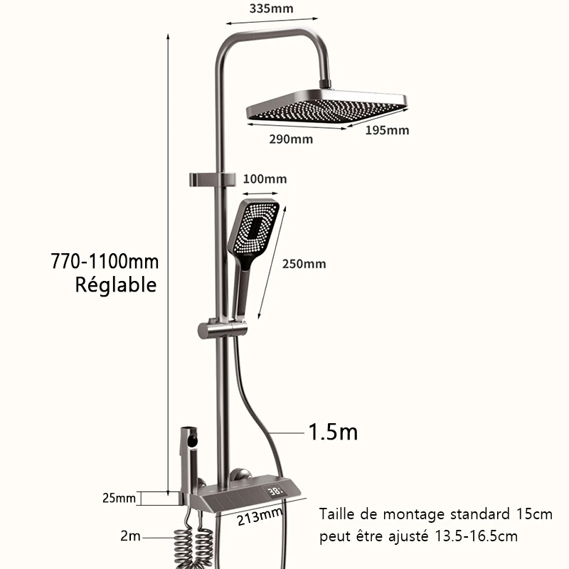 L’ensemble de douche est disponible dans des couleurs élégantes de gris noir et blanc, ainsi que gris mat pour s’adapter à tous les styles de salle de bains. Son design moderne et minimaliste s’intègre parfaitement dans n’importe quel décor.