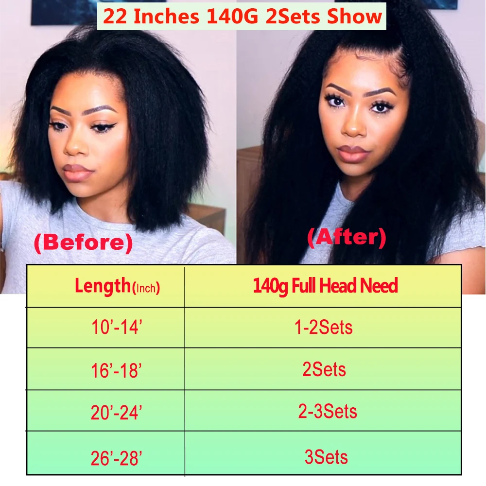 Les extensions de cheveux Afro Crépus à Clip Racily Hair-Afro Kinky Hétéro sont disponibles en 8 pièces par ensemble avec 18 clips. Elles pèsent 140g (4.93 oz). Les longueurs disponibles vont de 10 pouces à 26 pouces. Selon le volume de vos propres cheveux, généralement 1 ou 2 paquets suffisent pour remplir votre tête et augmenter la longueur et le volume. Si vous souhaitez des cheveux plus épais, il est recommandé d’acheter 3 ou 4 paquets.