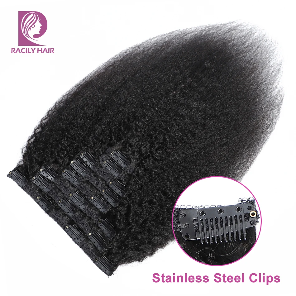 Les extensions à clip Afro Crépus à Clip Racily Hair-Afro Kinky Hétéro ont une double trame bien conçue, ce qui garantit une épaisseur conservée du haut à la fin et évite les enchevêtrements. Les clips sont en acier inoxydable avec une finition enduite de polymère, ce qui les rend invisibles et faciles à mettre et à enlever en quelques minutes.