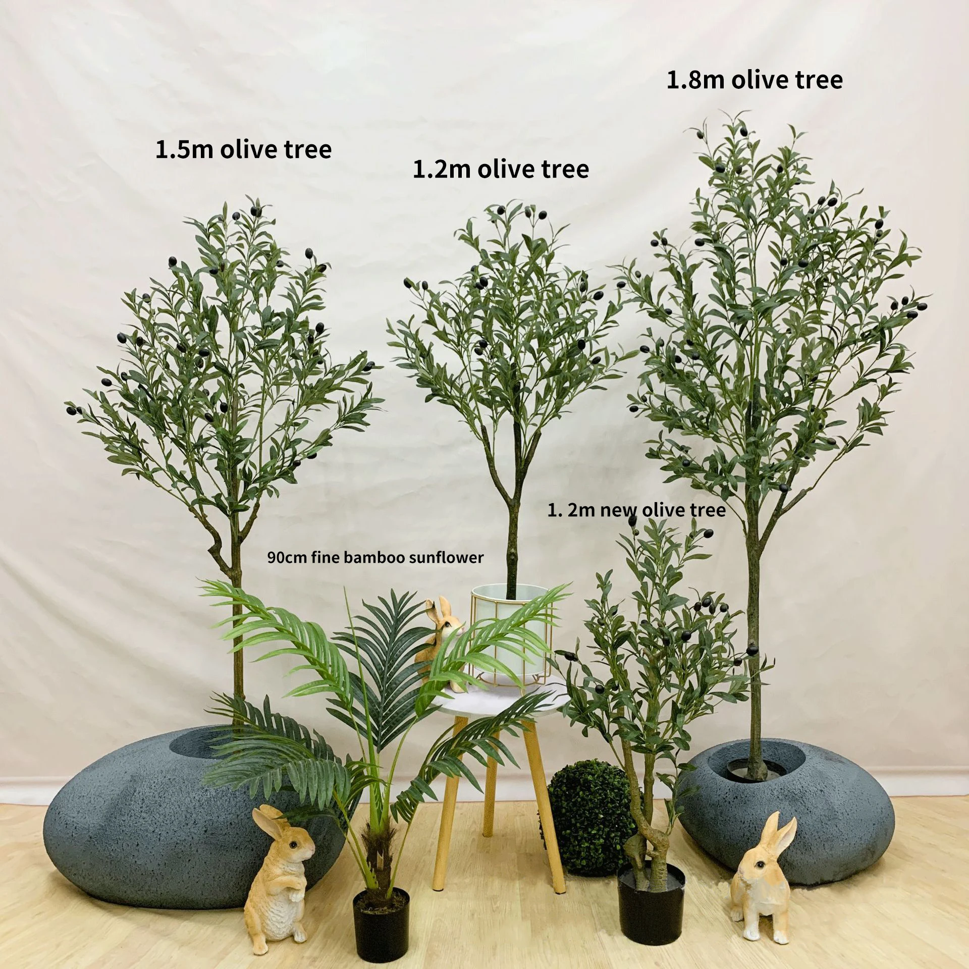 La plante artificielle d’olivier est disponible en cinq tailles : 60cm, 90cm, 120cm, 150cm et 180cm.