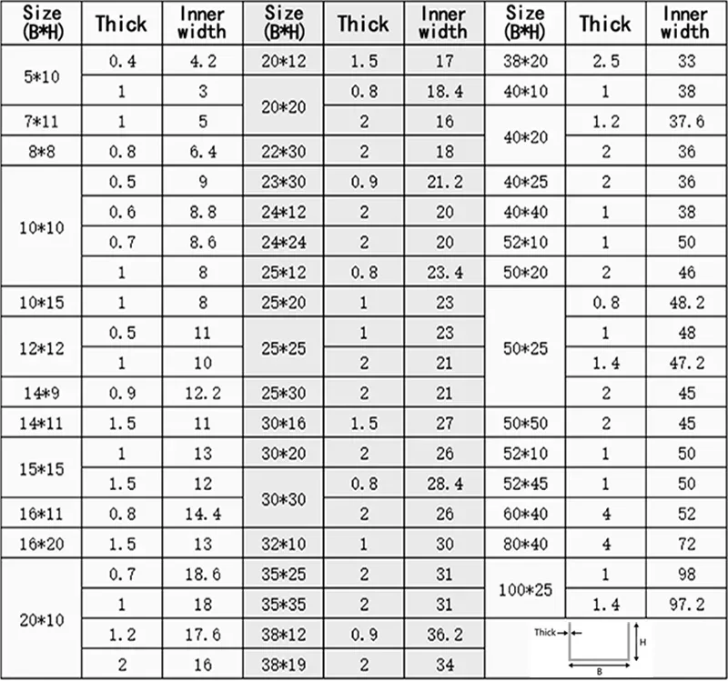 Le rail est disponible en différentes tailles : 5×5 mm, 5×10 mm et 100×25 mm. Il est également disponible dans des épaisseurs allant de 0,4 mm à 2 mm.