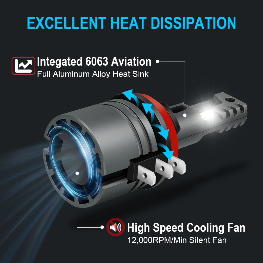 Le matériau en aluminium offre une excellente conductivité thermique de 401W/MK, ce qui permet de maintenir une température optimale et d’éviter la surchauffe. De plus, la conception du ventilateur turbo à 12,000 tr/min assure un refroidissement efficace et prolonge la durée de vie de l’ampoule.