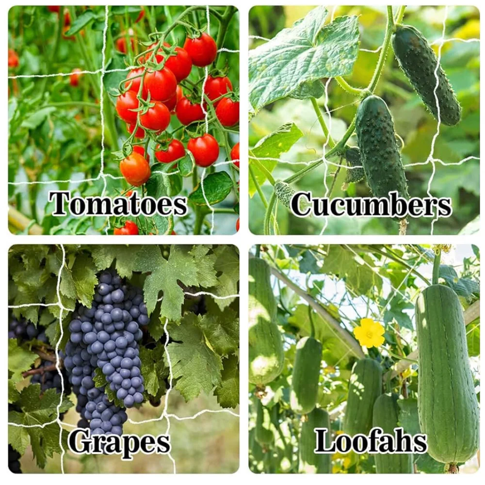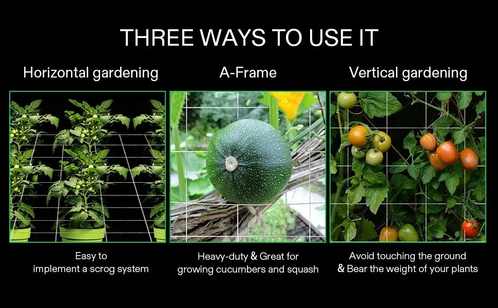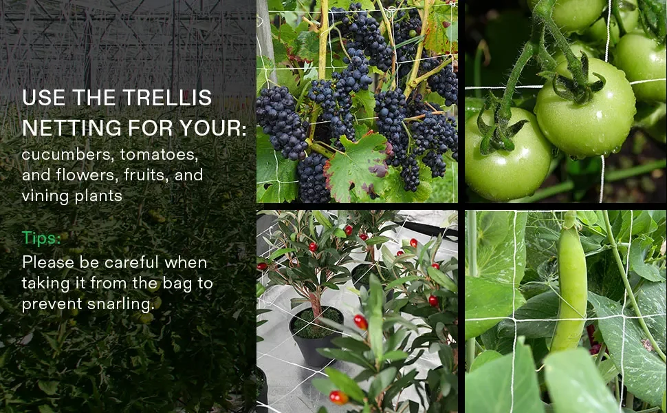 Support solide pour les haricots verts, les pois, les concombres, les tomates, le melon amer, les cukes, les mini-pastèques, les cantaloups, les mûres, les herbes, en utilisant le filet de treillis végétal pour éviter le contact avec le sol, les rendant moins sujets aux maladies.