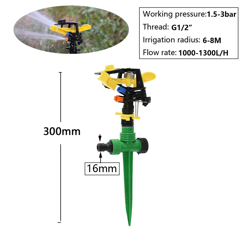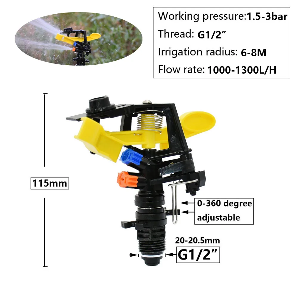 Les arroseurs à jet rotatif résistant à 360 sont des arroseurs d’irrigation agricoles de jardin avec une buse à bascule à double sortie. Ils ont un filetage mâle 1/2 pouces, ce qui les rend faciles à installer sur des tuyaux de raccordement de 1/2 ou 3/4 pouces. Ces arroseurs sont fabriqués en plastique de haute qualité et sont disponibles en différentes couleurs telles que le noir, le jaune, le bleu et l’orange.