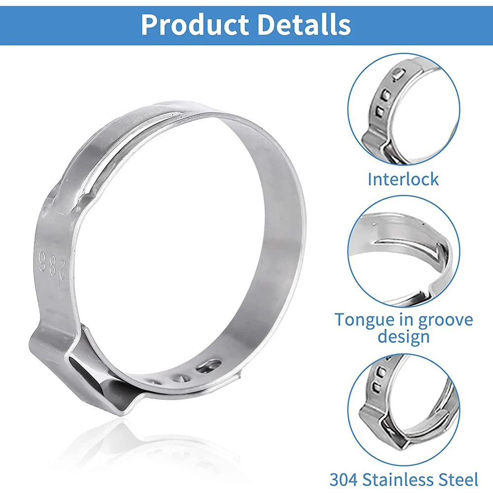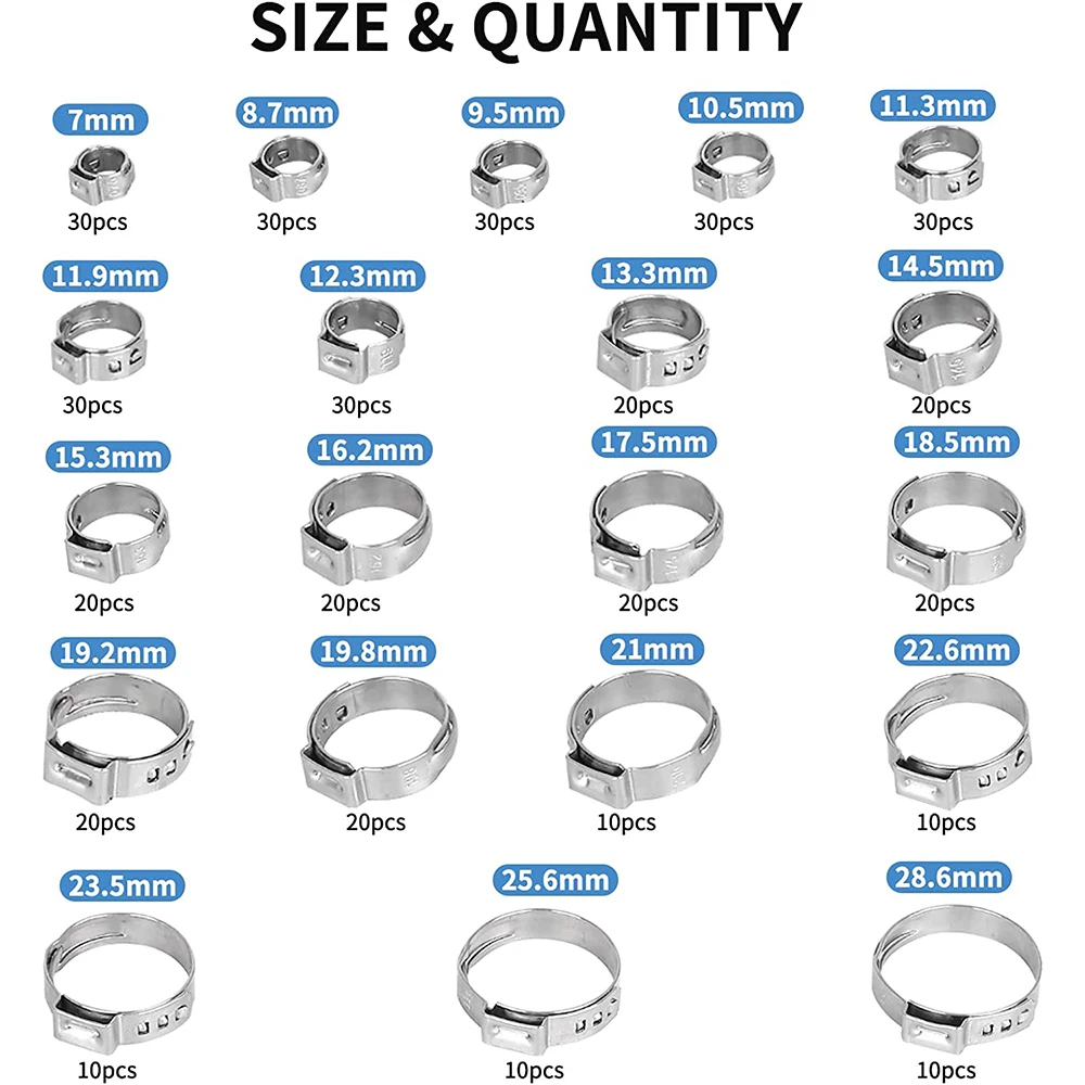 Les bagues PEX liness en acier inoxydable sont utilisées pour fixer les tuyaux et le sertissage de voiture. Ce kit combiné comprend 20 pieds de bagues PEX liness en acier inoxydable et 420 pièces. Les bagues PEX liness sont disponibles en 20 tailles différentes, allant de 7mm à 28.6mm.