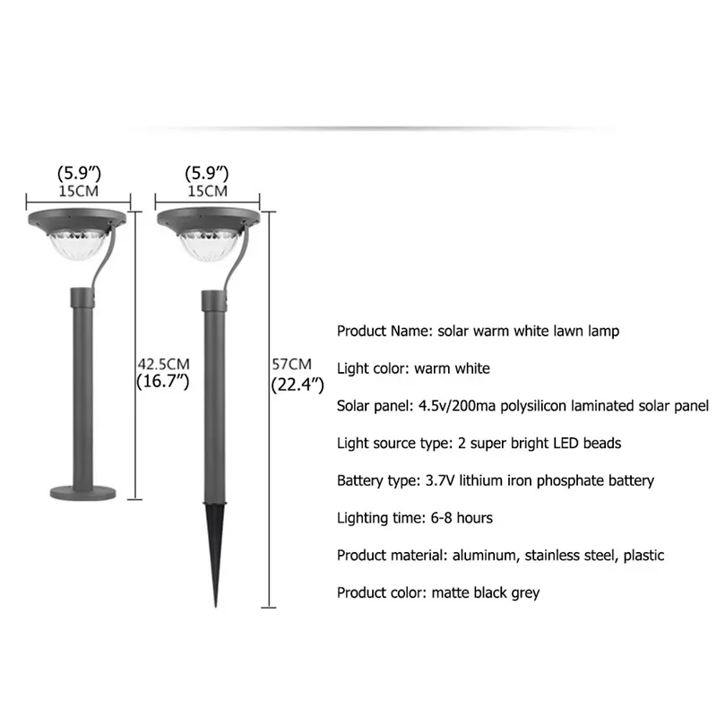 La lampe solaire LED imperméable pour pelouse est un luminaire d’extérieur idéal pour un jardin, une villa ou un paysage. Ce nouveau produit est doté de fonctionnalités avancées qui en font un excellent choix pour l’éclairage extérieur. Avec sa conception étanche, il peut être utilisé dans toutes les conditions météorologiques. Les perles de lampe LED super lumineuses offrent un éclairage puissant et une longue durée de vie. Le panneau solaire stratifié en poly silicium garantit une excellente conversion de l’énergie solaire en électricité, permettant ainsi à la lampe de fonctionner pendant 6 à 8 heures après une charge complète. Fabriqué en aluminium, acier inoxydable et plastique, ce produit est à la fois solide et durable. Son poids léger de 0,45 kg le rend facile à transporter et à installer. La couleur du produit est un élégant gris noir mat qui s’intègre parfaitement à n’importe quel style de jardin ou de paysage.