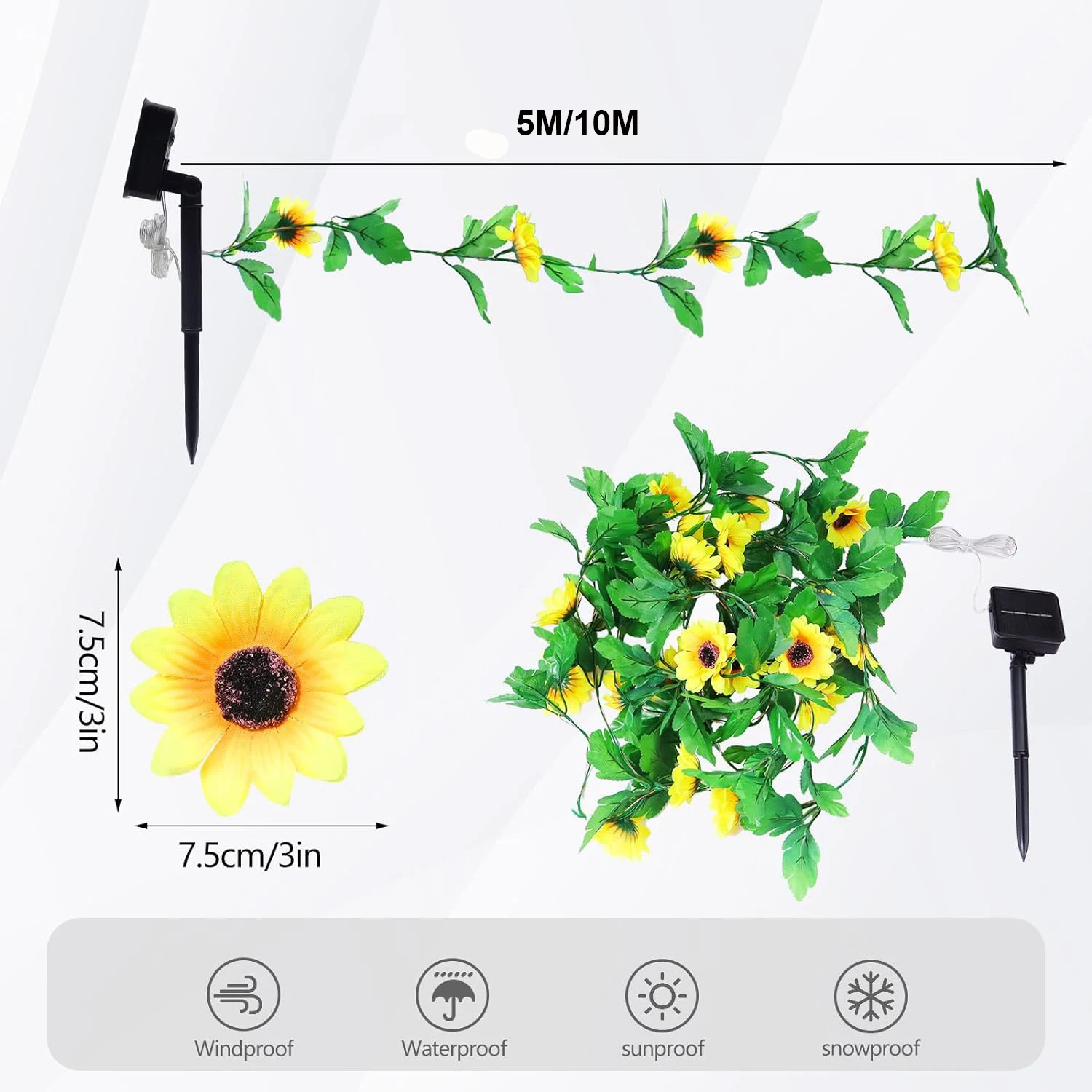 La conception étanche IP65 de la guirlande lumineuse de tournesol garantit que cette lumière LED peut résister à la pluie, qu’il pleuve, qu’il vente ou qu’il neige, elle égaiera votre jardin.