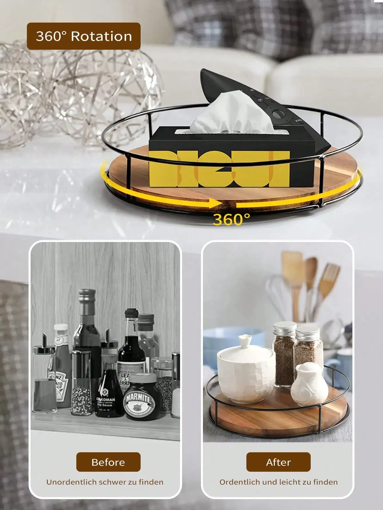 La Lazy Susan en bois est à la fois belle et peu encombrante, ce qui la rend parfaitement adaptée aux comptoirs de cuisine, aux tables à manger et même aux tables en plein air. C’est un choix idéal lorsque vous organisez de délicieux rassemblements pour tout le monde. De plus, elle est également très appropriée comme cadeau pour ceux qui aiment le stockage familial.