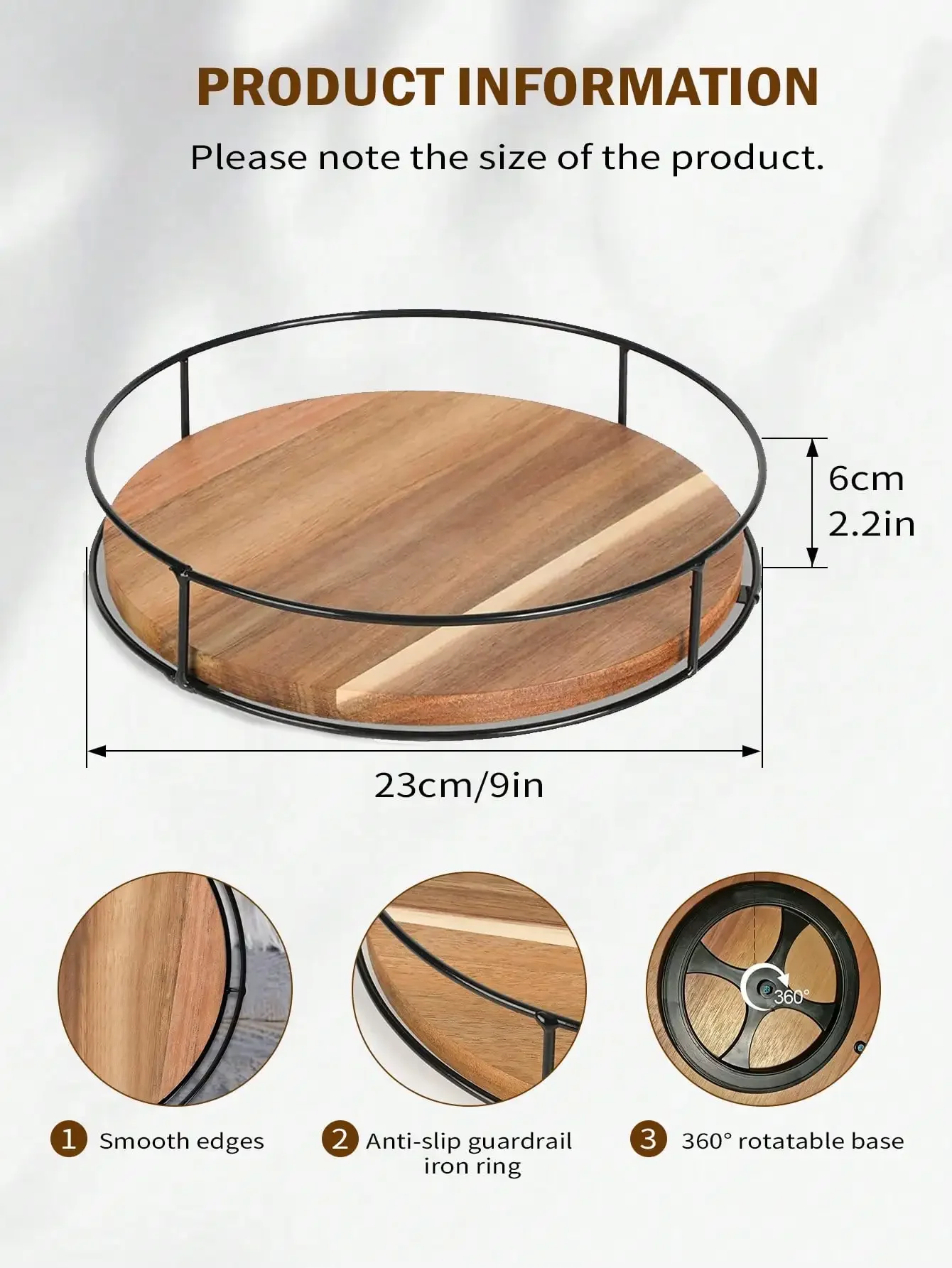 La Lazy Susan-Table à manger ronde en bois d’acacia de 9 pouces est un accessoire de cuisine polyvalent et pratique. Mesurant 9” de diamètre avec un bord de cadre en fer de 2.2” de hauteur, cette table tournante susan paresseuse est conçue pour contenir des condiments, des épices et des produits de boulangerie. Elle facilite l’accès aux articles, même lorsqu’ils sont rangés sur les étagères supérieures ou dans les armoires d’angle.