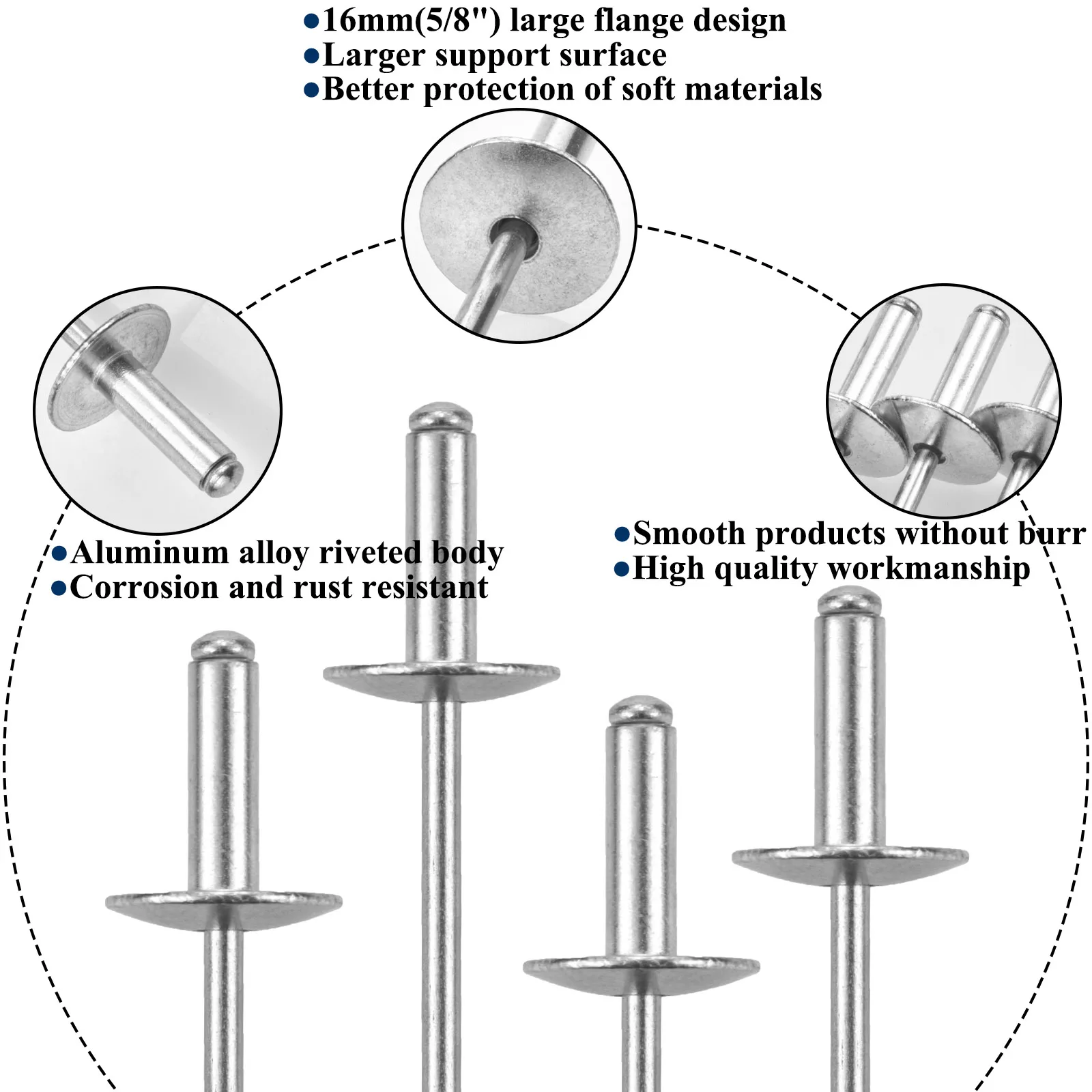 Cet ensemble contient 30 rivets aveugles avec une grande bride en aluminium. L’emballage vous permet d’avoir suffisamment de rivets pour vos projets.