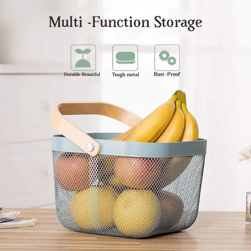 La conception ouverte permet de trouver facilement et rapidement ce dont vous avez besoin. Le design moderne rend votre espace propre et bien rangé. La maille métallique est robuste et durable, et la poignée en bois est facile à transporter. Il peut être utilisé pour organiser divers articles ménagers et articles de cuisine, tels que des fruits, de la nourriture, des jouets, des articles de toilette, etc. Cadeau parfait pour la famille et les amis.