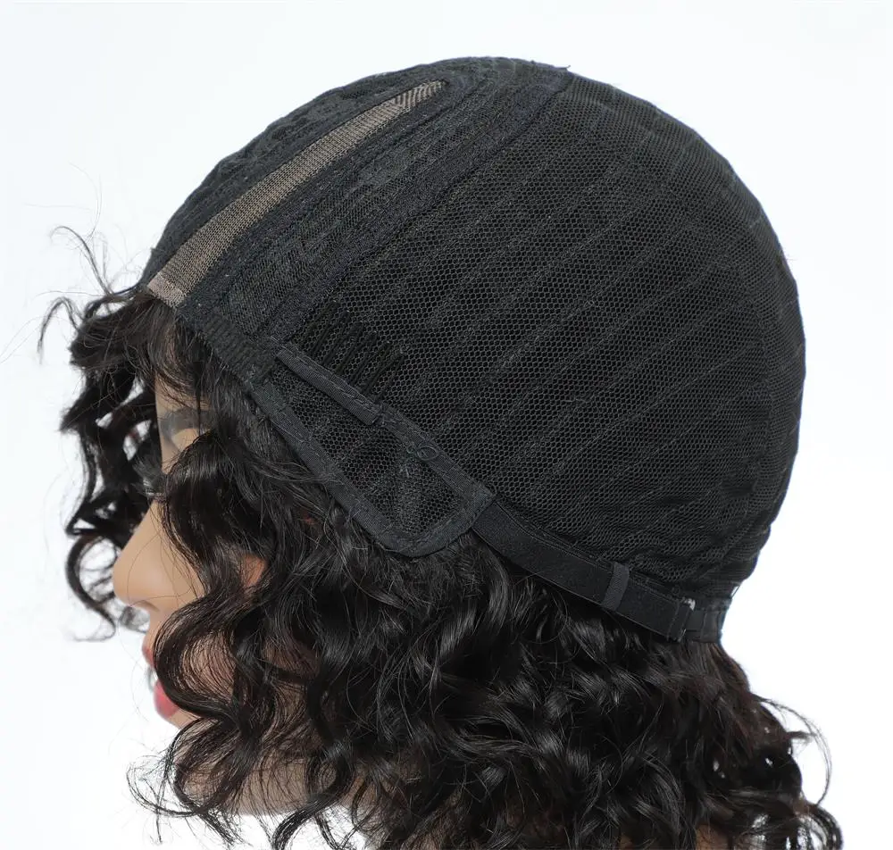 Perruque de cheveux humains bouclés Jerry avec frange, Bob court, perruque complète faite à la Machine pour femmes noires, couleur naturelle, densité 180, 5×1 partie