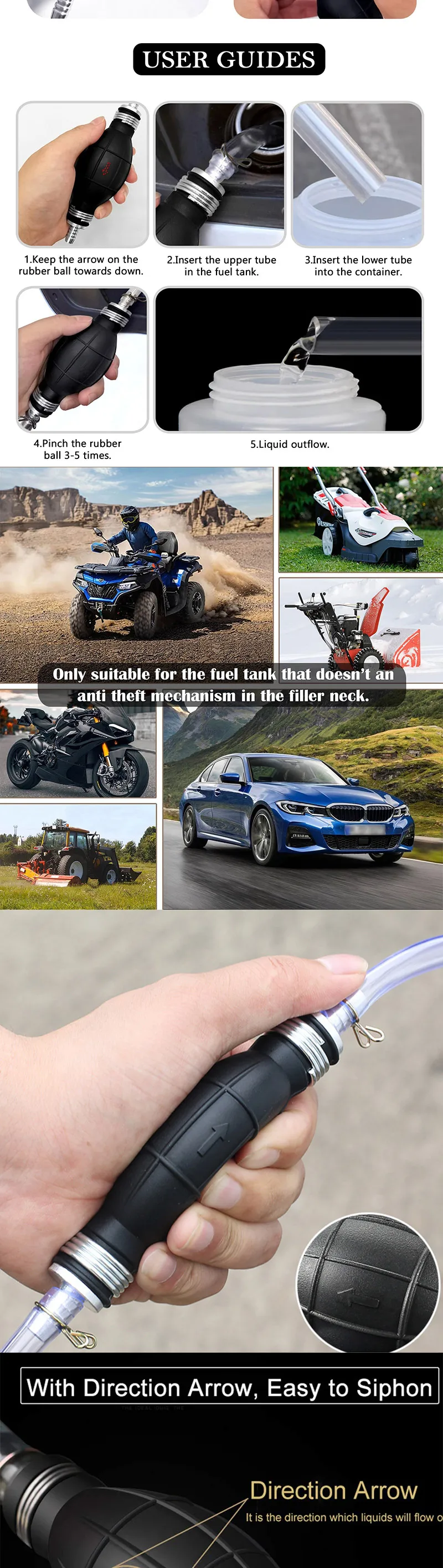 Ce kit de pompe à siphon convient aux véhicules et équipements sans filtres antivol, tels que tondeuses à gazon, chasse-neige, motos, VTT, tracteurs de pelouse, taille-haies, bateaux et plus encore. Convient également aux aquariums, aquariums, baignoires, etc.