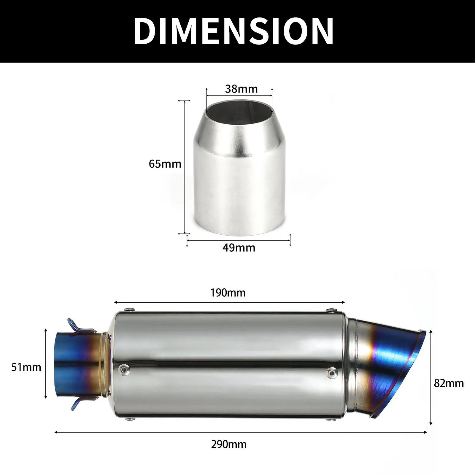 Le diamètre de connexion de ce tuyau d’échappement est de 38-51mm (1.5-2.0 pouces).