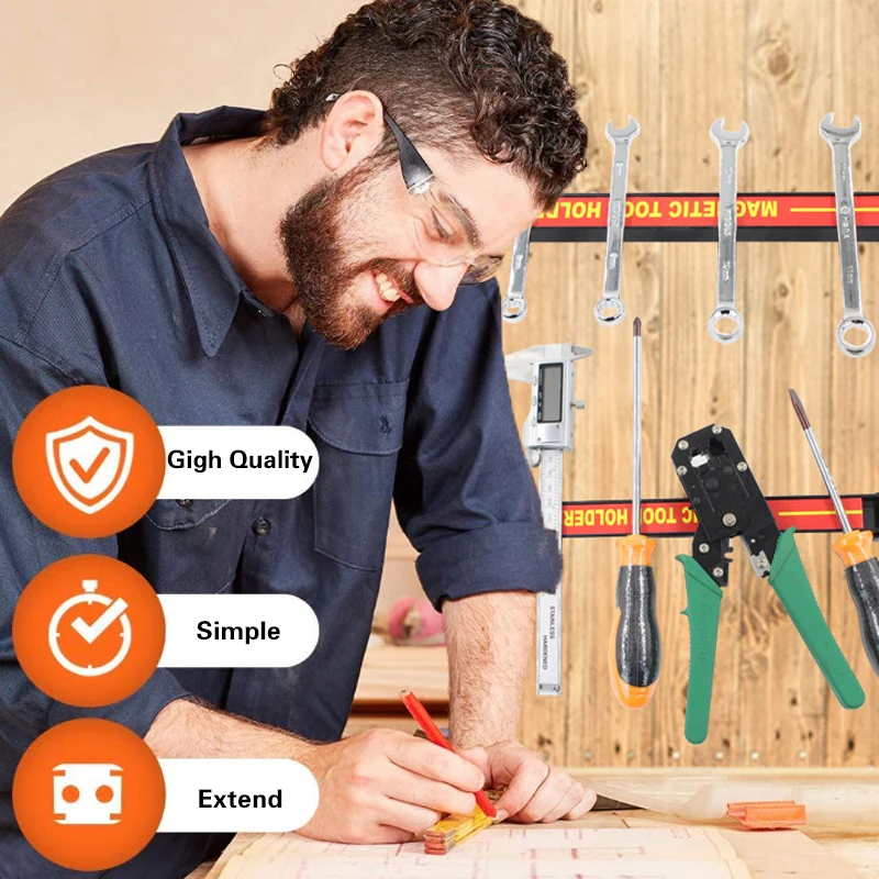 Le porte-outil magnétique est livré avec trois tailles différentes, qui comprend 1 barre d’outil magnétique de 8 pouces, 1 barre d’outil magnétique de 12 pouces et 1 barre d’outil magnétique de 18 pouces. Cette combinaison peut répondre à vos différents besoins de stockage et en même temps augmenter l’efficacité d’utilisation du produit.