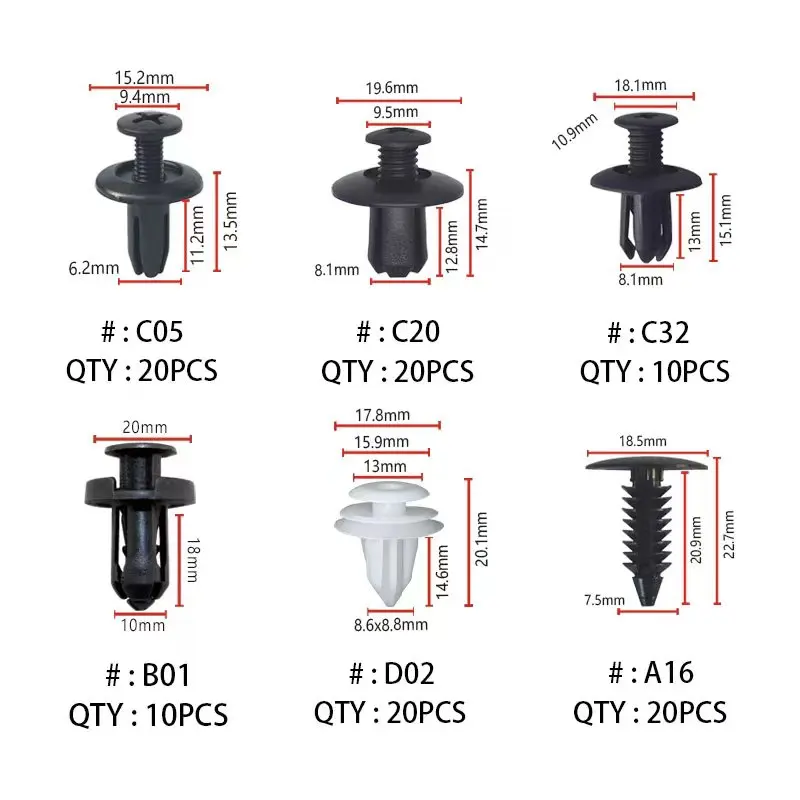Le kit comprend 20 attaches à rivets C05, 20 attaches C20, 10 attaches à rivets C32, 10 attaches B01, 20 rivets de fixation D02 et 20 attaches A16. De plus, il est livré avec un sac OPP ou un sac OPP mixte ou une boîte en plastique.