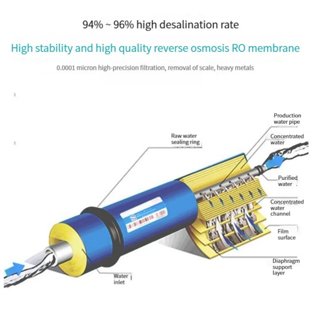 Approprié pour être utilisé dans les systèmes RO parfaitement, la membrane est faite de la membrane semi-perméable avec le diamètre 0.0001 précision de filtration micon, il assure l’élimination de ces substances nocives asminuscule, impuretés, colloïdes, matières organiques, métaux lourds, dissous, solides, bactéries et virus.