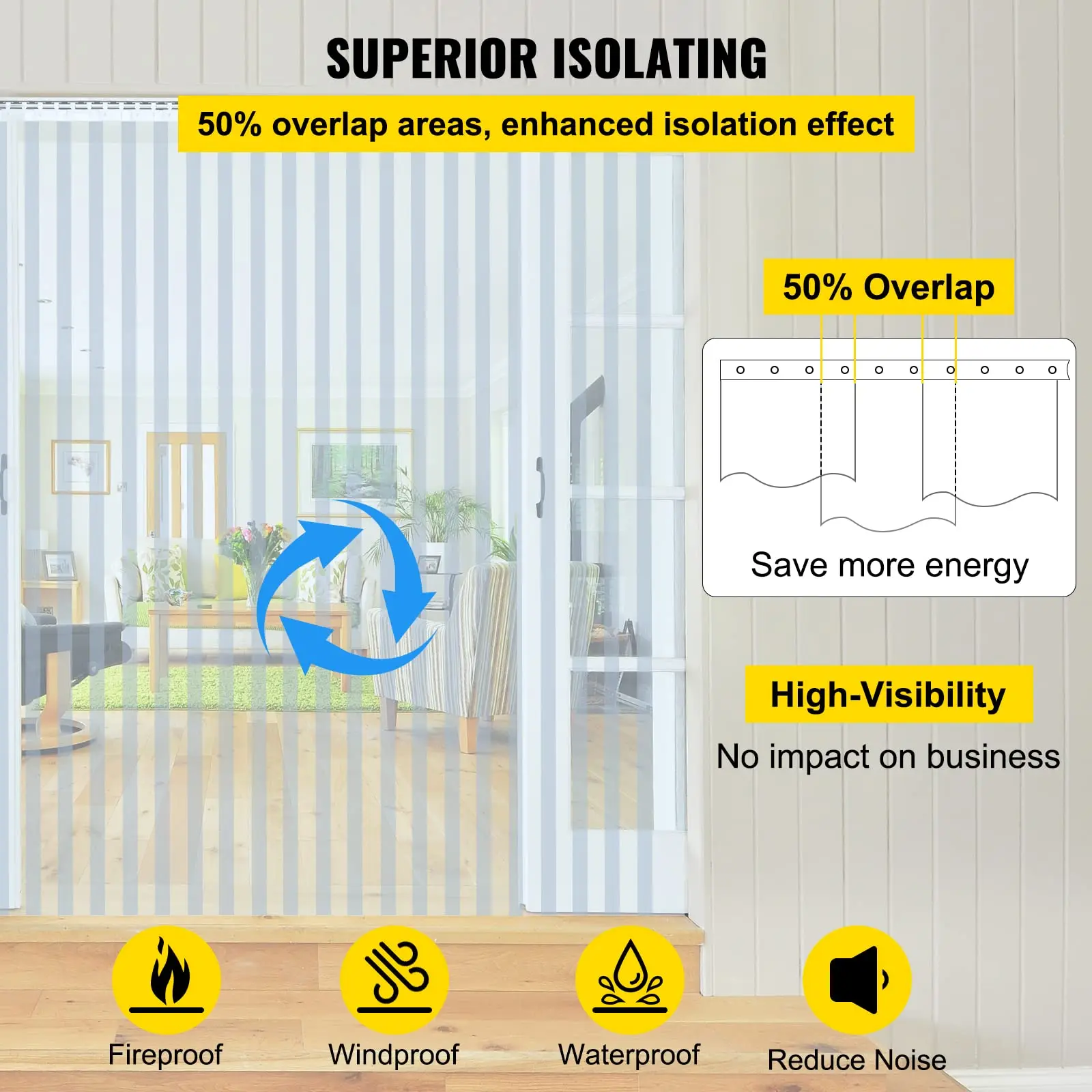 | 50% zone de chevauchement | Le chevauchement de notre rideau de porte en bande est mesuré à 50%, offrant une meilleure isolation contre le vent et l’air froid. |