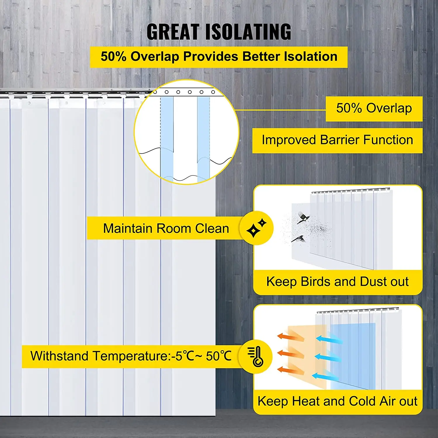 Ce rideau en PVC est à la fois esthétique et économique. Il peut prévenir les bruits, les moustiques, le vent, la pluie et le soleil. Il convient pour une utilisation dans les salles propres, les entrées de cantines, les boutiques spécialisées climatisées, les supermarchés, les cages d’escalier, les salles de bains, les entrées d’hôpitaux, etc. Il est respectueux de l’environnement et durable.