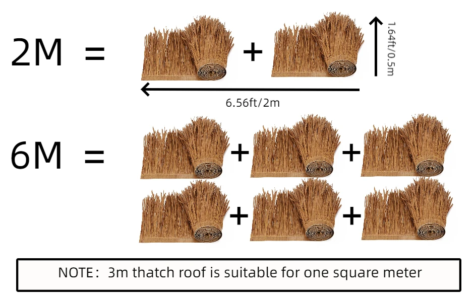 Vous recevrez 2m/6m de toit de chaume artificiel. Chaque pièce est 3.28 * 1.64ft (1*0.5m).