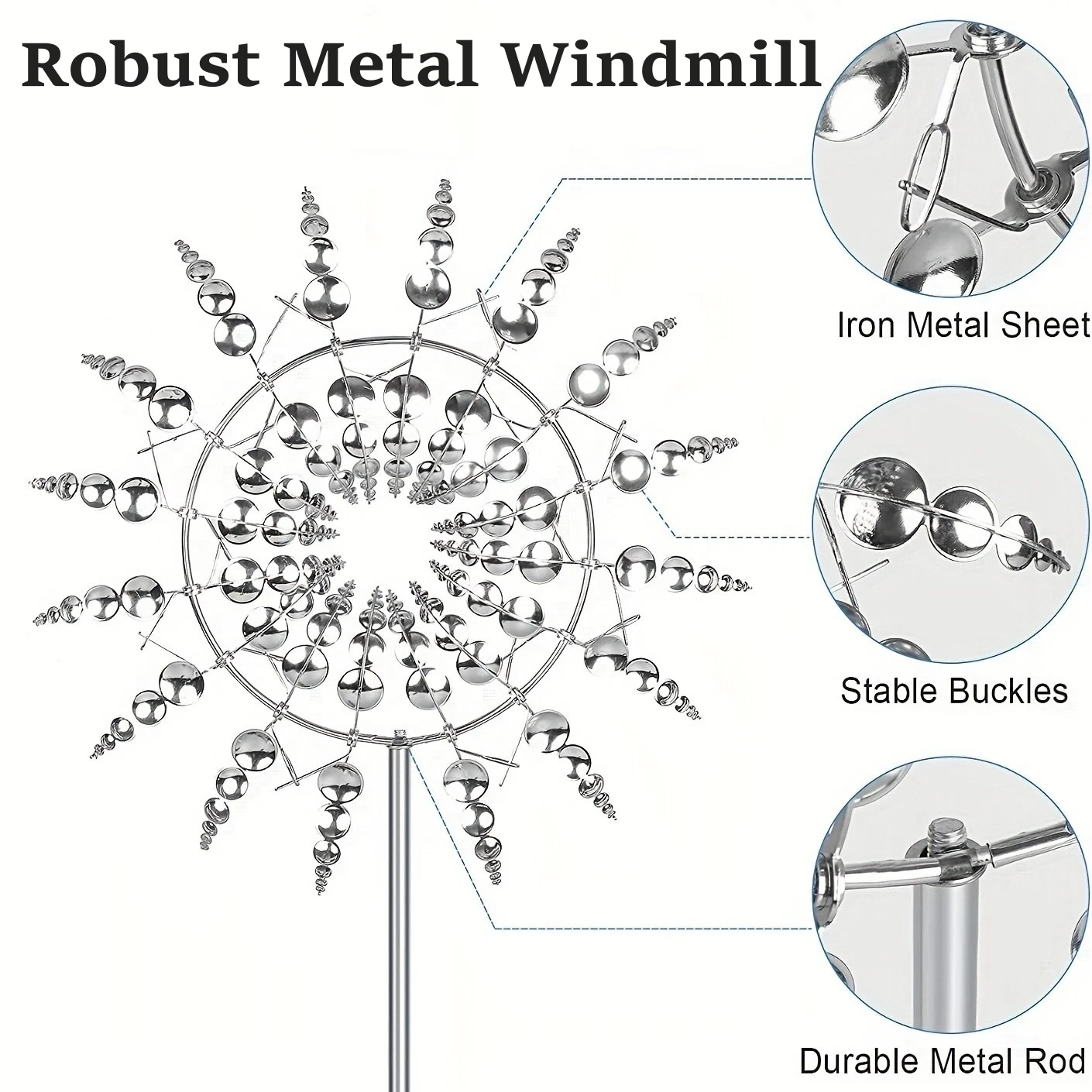 Cette œuvre d’art extérieure spécialement conçue, chaque lame du spinner de patio est conçue pour tourner dans une direction différente, et la structure de roulement à billes permet à notre capteur de vent de tourner tranquillement même dans des vents légers.