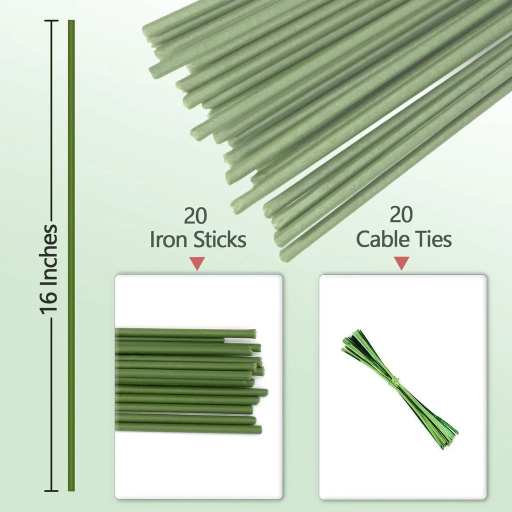 Taille et emballage: nous avons conçu 16 pouces/40cm pour votre choix. Veuillez vous assurer de choisir la bonne taille avant d’acheter. Un paquet comprend 20 piquets de plantes et un paquet de ruban de cerclage.