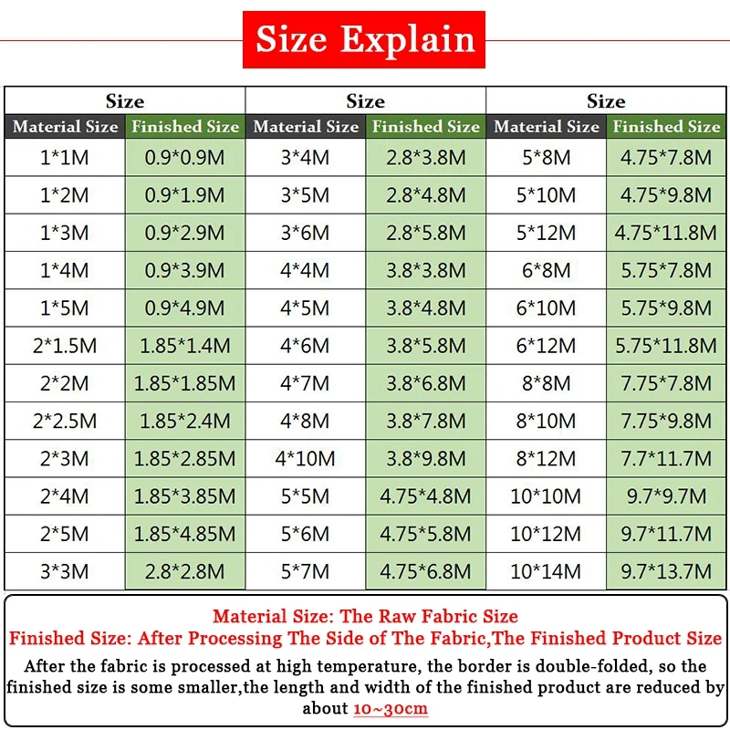 En raison de la perte de matière pendant le processus de fabrication, la taille du produit fini sera réduite d’environ 10 à 20cm