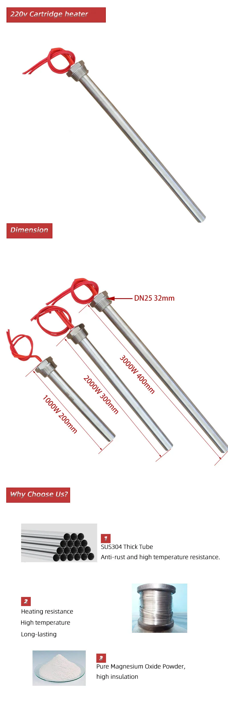 - Facile à installer: la cartouche chauffante est équipée d’un filetage DN25(32mm) pour une installation simple et pratique.