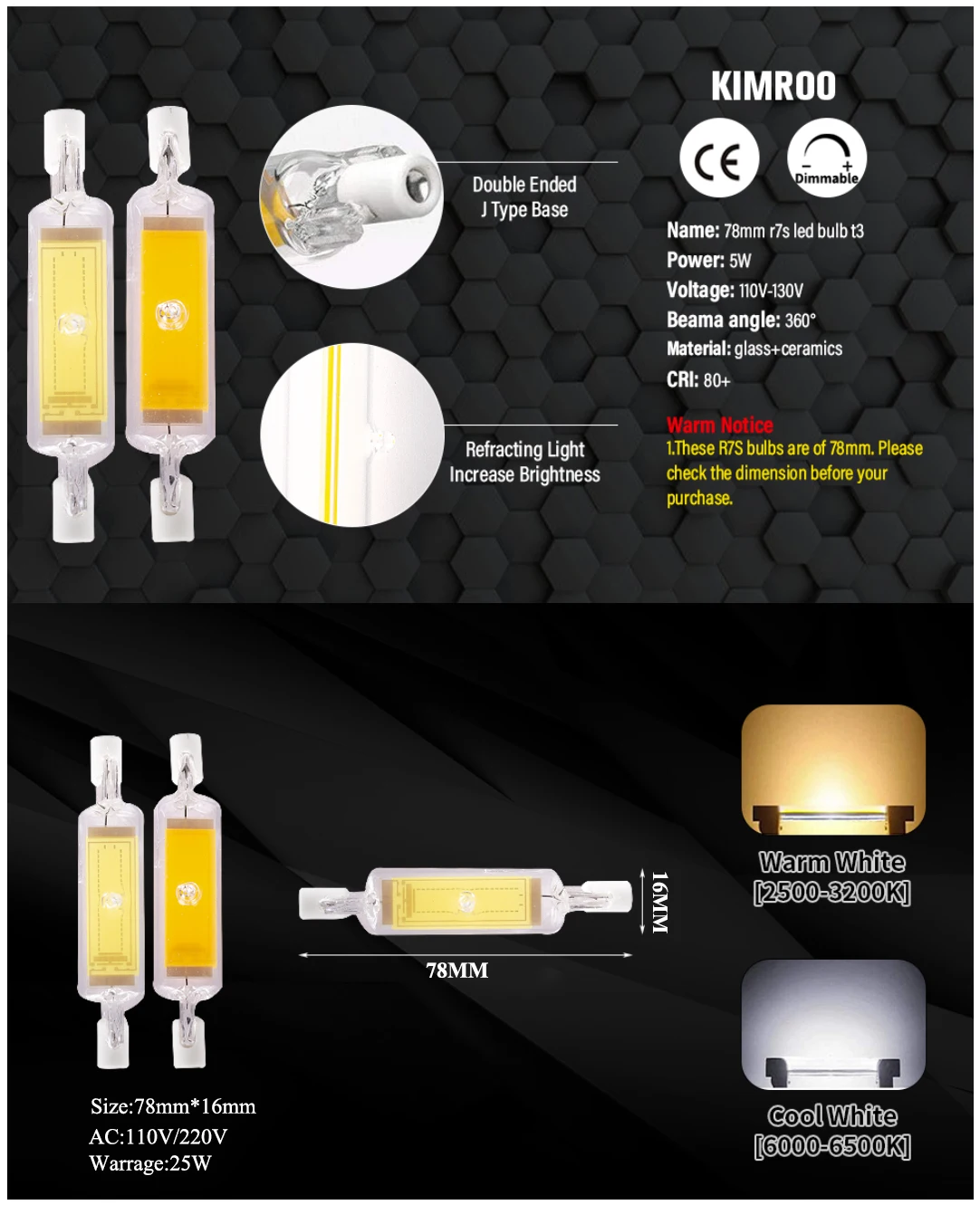 - Couleur de la lumière : blanc chaud (2900-3200k), blanc froid (6000-6500k)