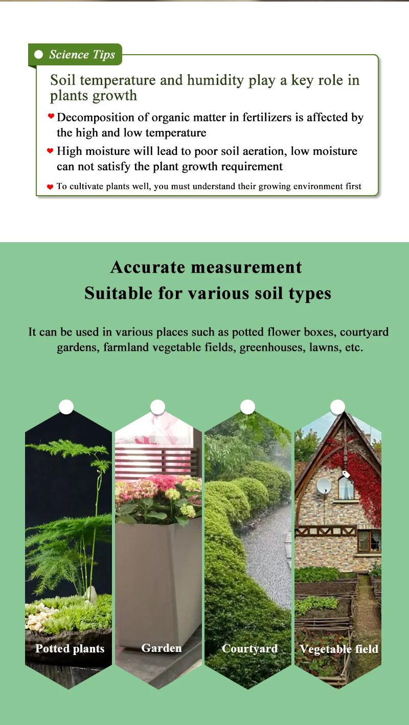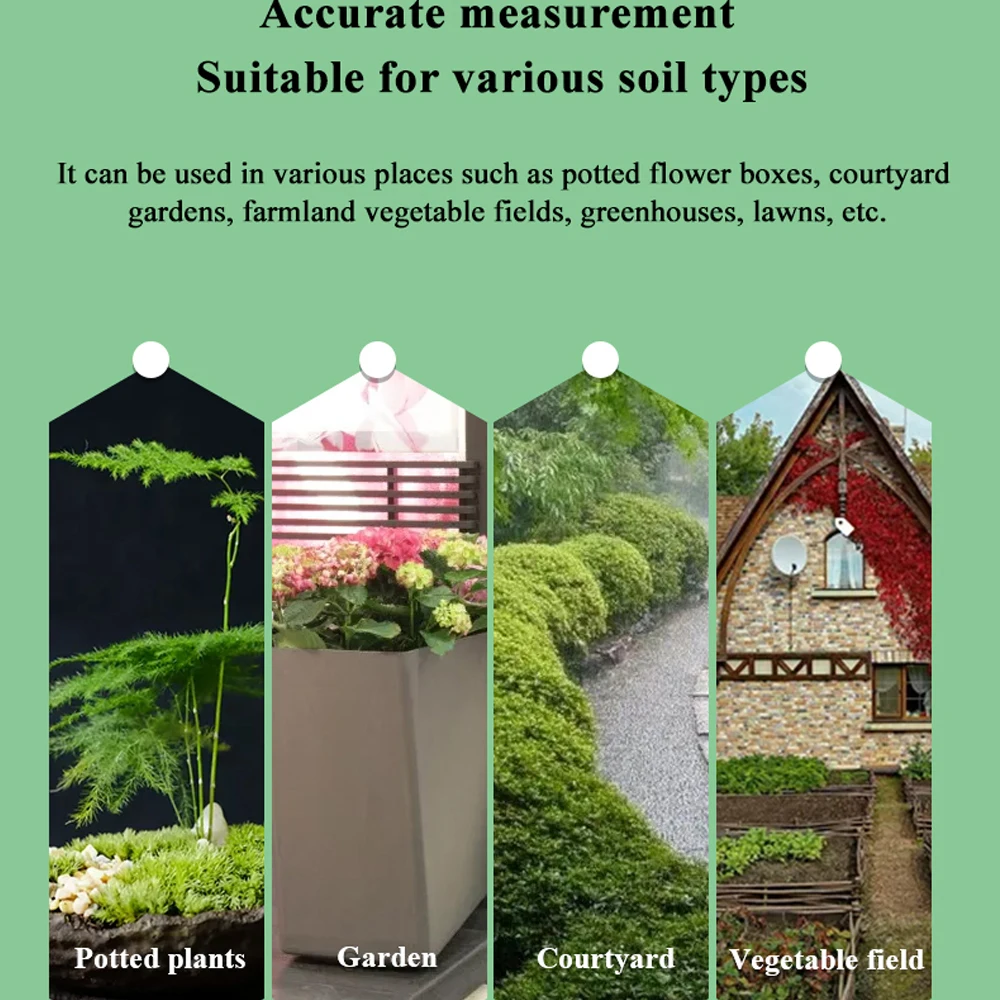 Ce testeur de sol convient à une grande variété d’endroits, tels que les plantes en pot, les serres de légumes, les terres agricoles, les champs de légumes, les pelouses, etc.