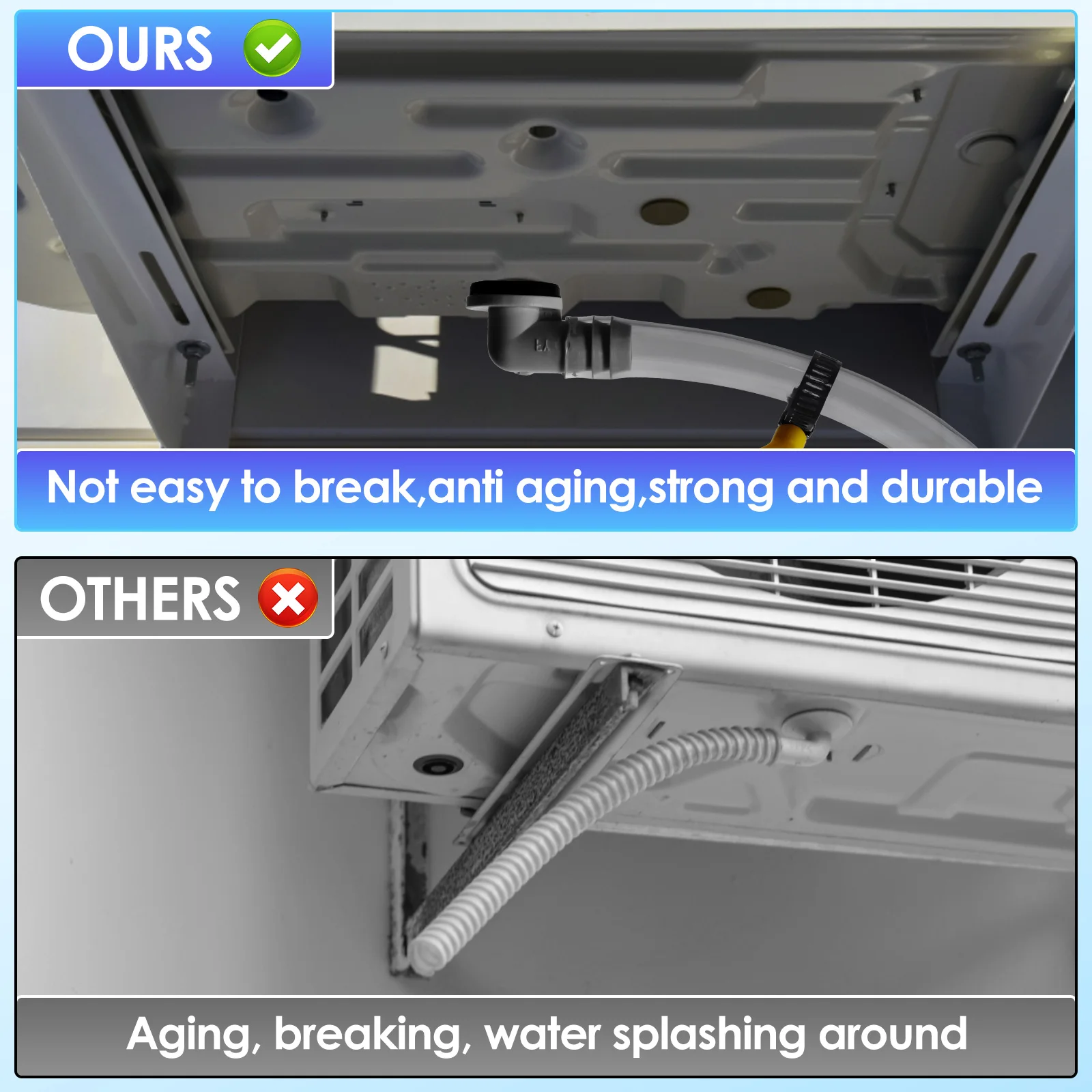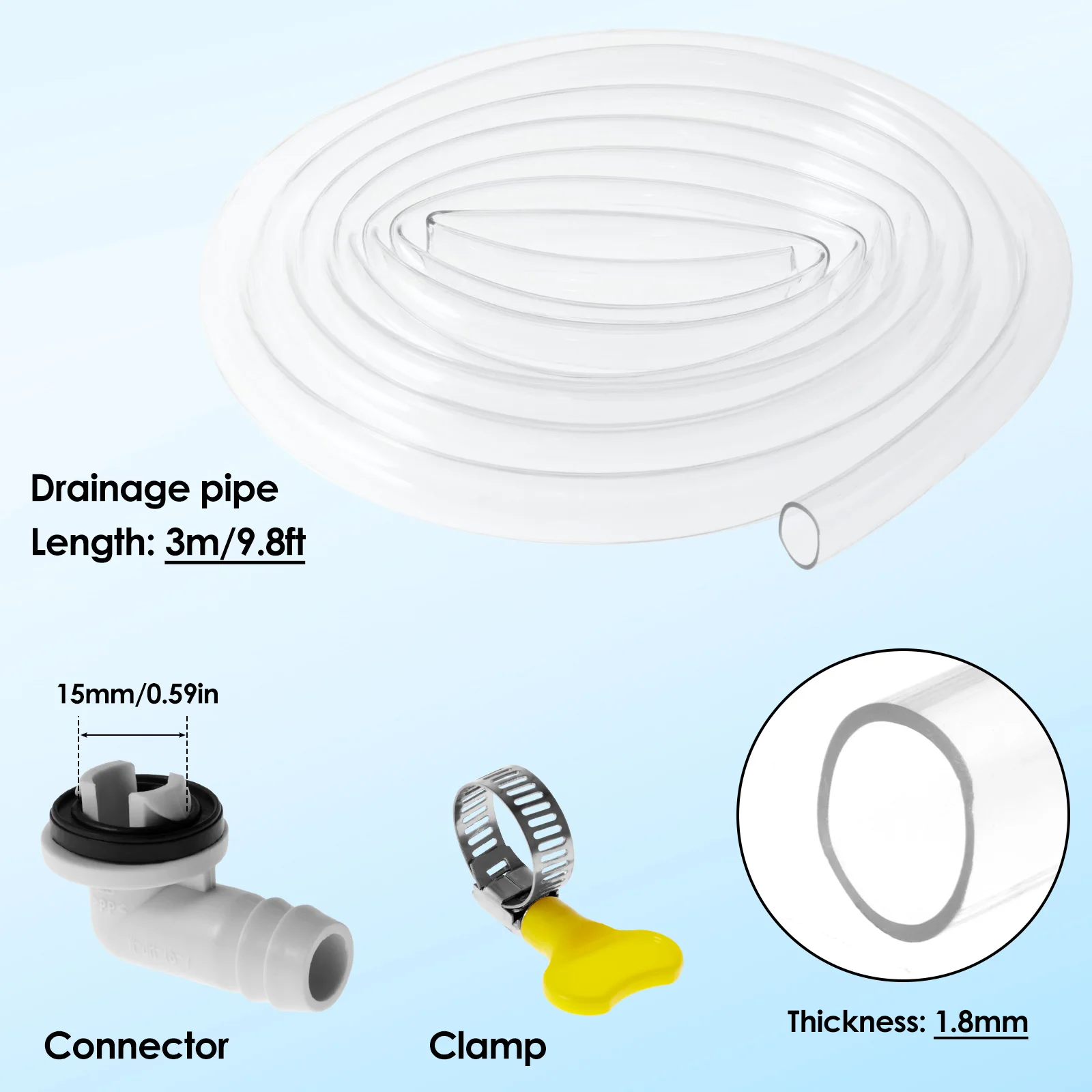 Le tuyau d’évacuation du climatiseur mesure environ 9,8 pieds de long, ce qui permet de répondre aux exigences de drainage à différentes hauteurs. Le connecteur a un diamètre d’environ 15mm/0.6 pouces. Il est important de confirmer la taille du trou de vidange de votre climatisation avant d’acheter. Le tuyau dispose également d’une conception étanche avec une couche d’anneau en caoutchouc au joint, ce qui assure une connexion étanche pour éviter les fuites ou les gouttes d’eau. Le matériau du tuyau est en ABS de haute qualité avec une épaisseur de 1,8mm/0.07, ce qui le rend résistant aux environnements extérieurs, durable et non susceptible de vieillir ou de se déformer. Le paquet comprend également un connecteur de tuyau de vidange (15mm/0.6 de diamètre) et un collier de serrage de tuyau de vidange pour faciliter le drainage de la climatisation.