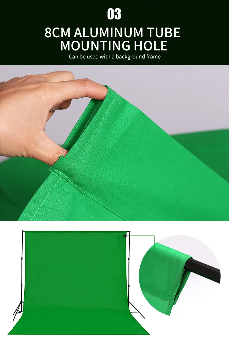 Le fond d’écran vert pour studio photo est fait en mousseline de coton et est disponible en plusieurs tailles (3x6m et 2x3m). Il est également proposé dans les couleurs blanc, noir et gris. Ce produit est doté d’une poche pratique pour un rangement facile. Le tissu est épais et résistant à l’usure. Il est non réfléchissant et dispose d’une couture exquise pour une durabilité maximale.