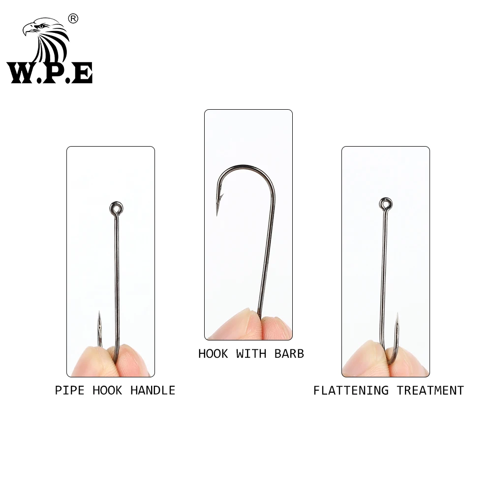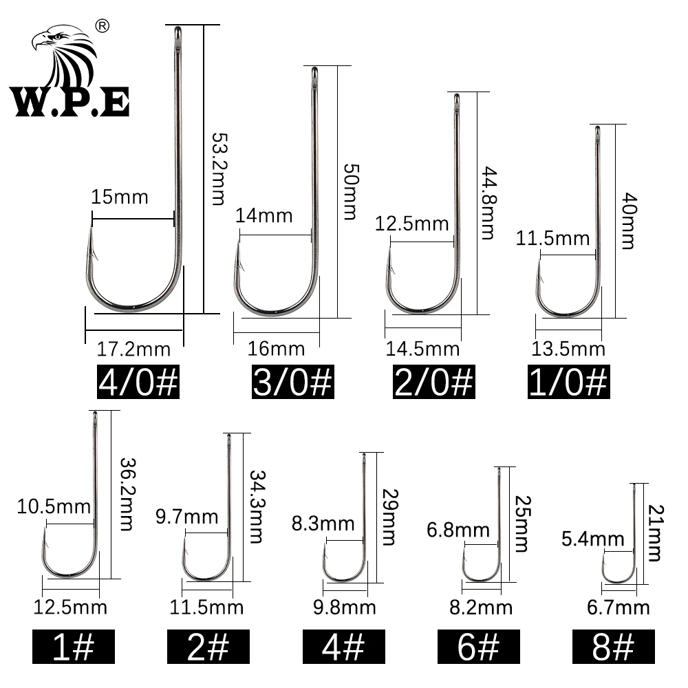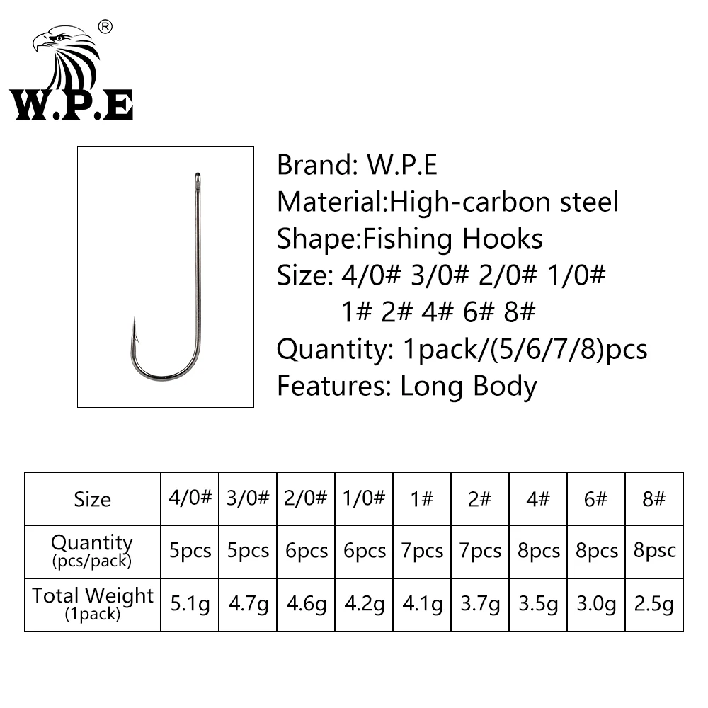 Le hameçon de pêche W.P.E est fabriqué en acier à haute teneur en carbone, ce qui lui confère une grande résistance et durabilité. La forme du crochet est droite avec un large écart, ce qui facilite l’accrochage du poisson. Disponible en plusieurs tailles, de 4/0# à 8#, il convient à différents types de poissons.