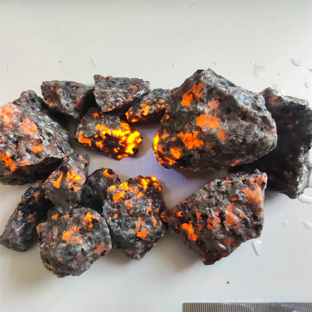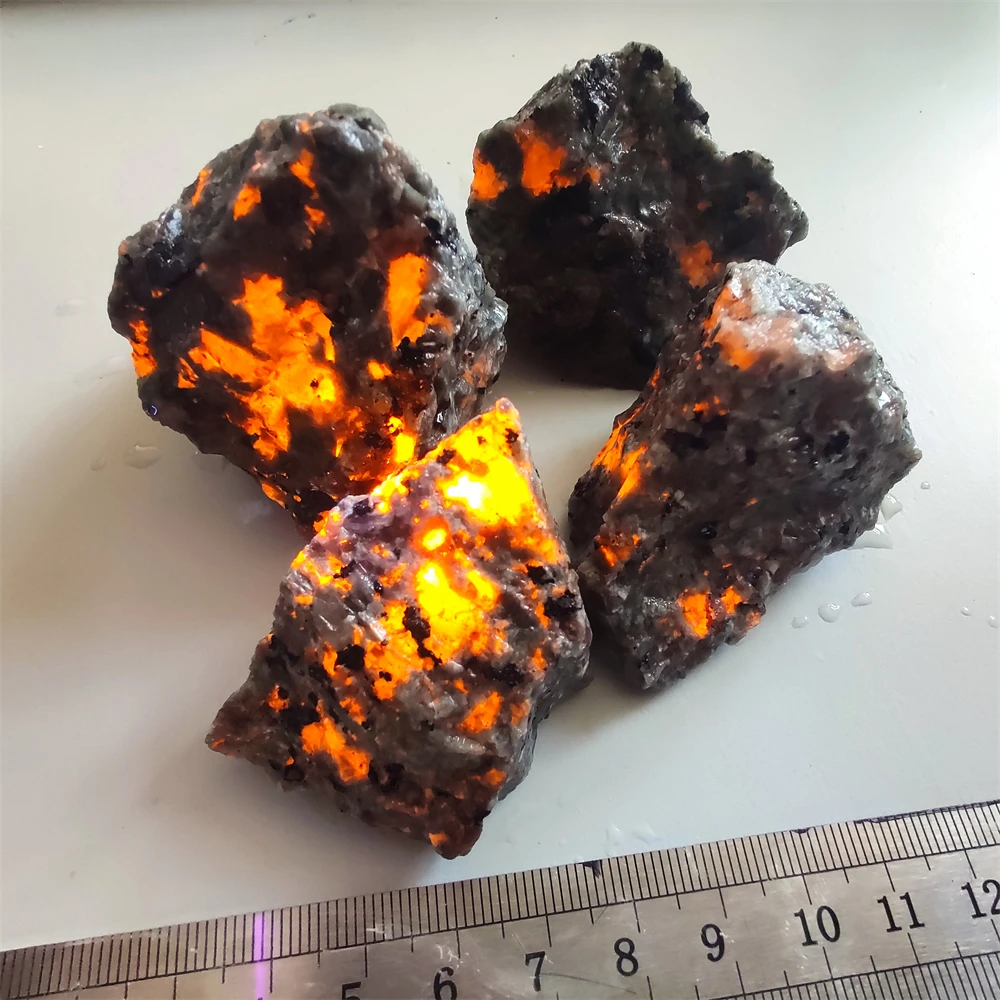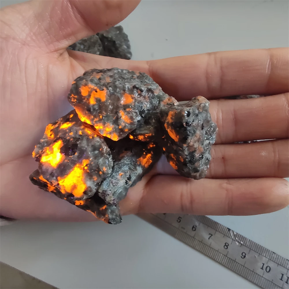 La Pierre de flamme de Yooperlites brute naturelle est une syénite contenant de la sodalite fluorescente. Elle émet de belles flammes sous la lumière ultraviolette, avec un effet d’affichage variable selon les différents rayons ultraviolets (UVA, UVB, UVC). Pour profiter pleinement des effets fluorescents, il est recommandé d’utiliser des lampes UV à ondes longues de 365 nm.